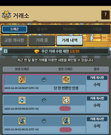 이 분은 잡 5세대 거들해치(암)을 제시하셨고, 제가 족보확인을 미처하지못하고 수락을 눌렀습니다.