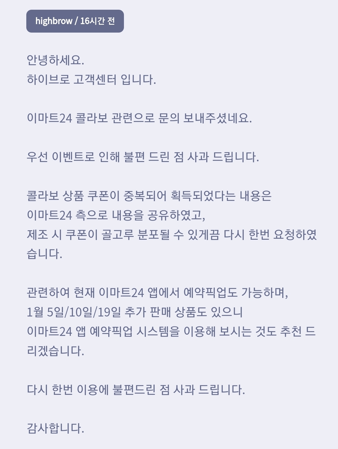콜라보 상품 쿠폰이 중복으로 와서 문의 했습니다.