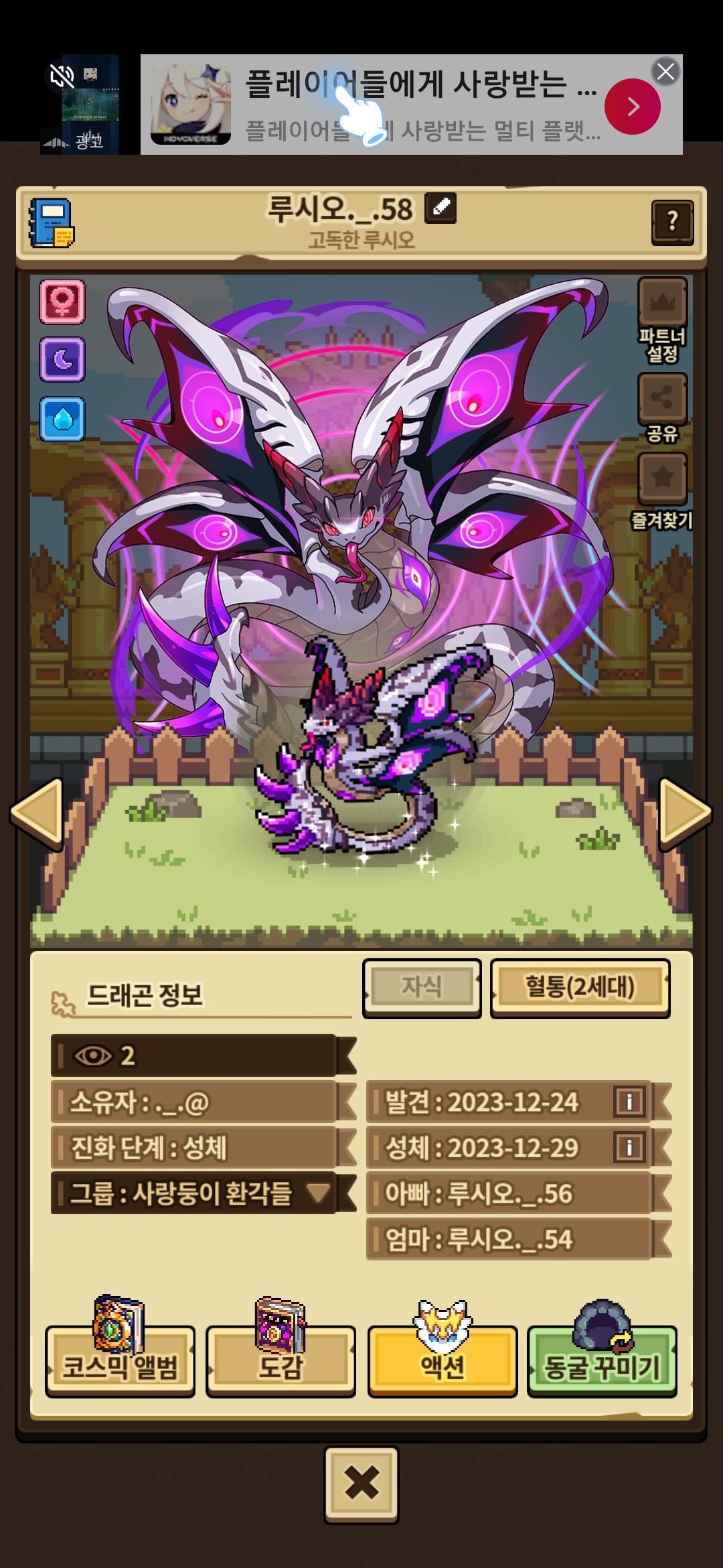 전 게임 처음 시작하고 닉네임 정할 때 ._. 쳐봤는데 이미 사용중이래서 뒤에 아무 의미 없는 @를 하나 붙여가지고 인겜닉이 ._.@거든요? 그래서 초창기때는 (드래곤 이름)._.@ (드래곤 이름)._.@@ 이런식으로 뒤에 골뱅이를 하나씩 늘리면서 애칭 지어줬었는데 지금은 위에 루시오처럼 (드래곤 닉넴)._.(번호) 이렇게 지어주고 있어요! 여러분은 애칭 어떻게 지으시나요?