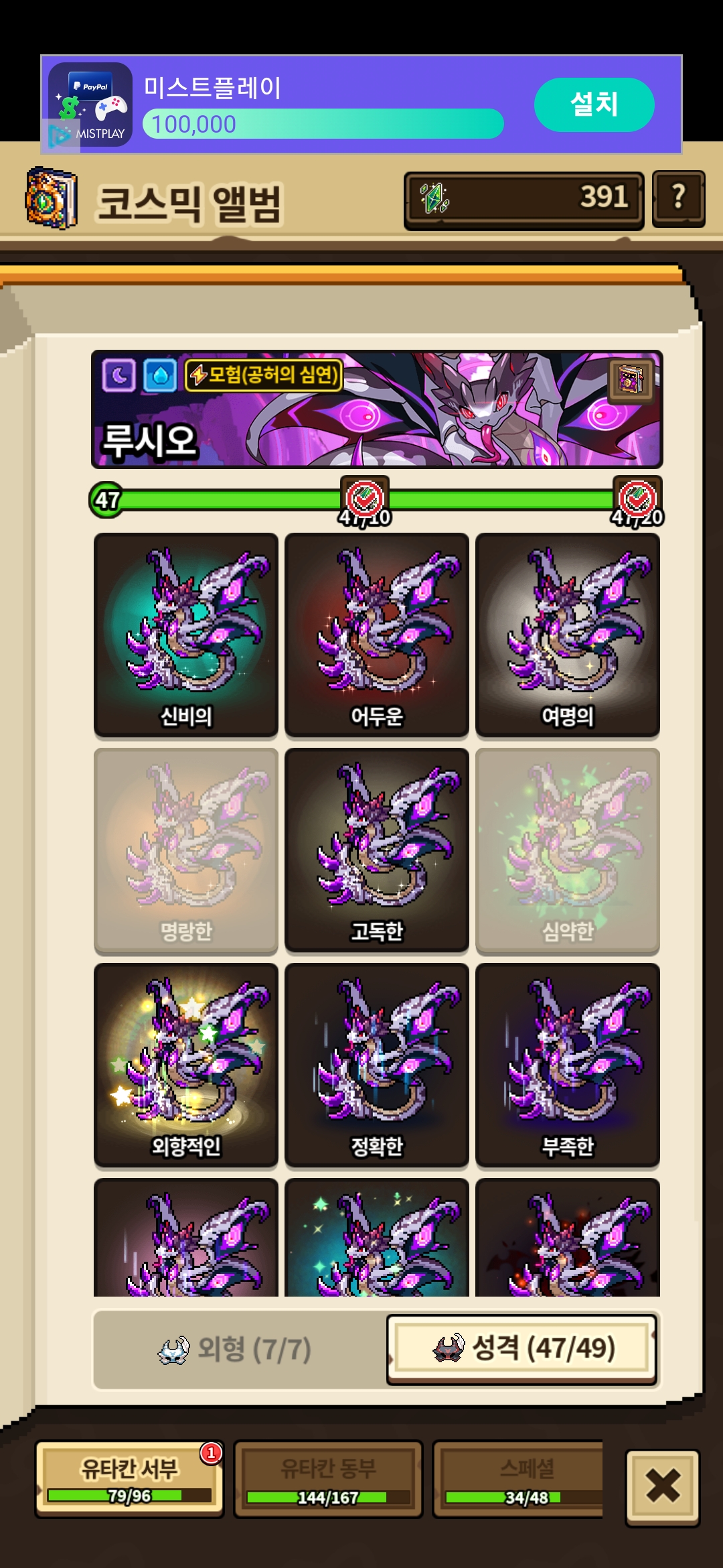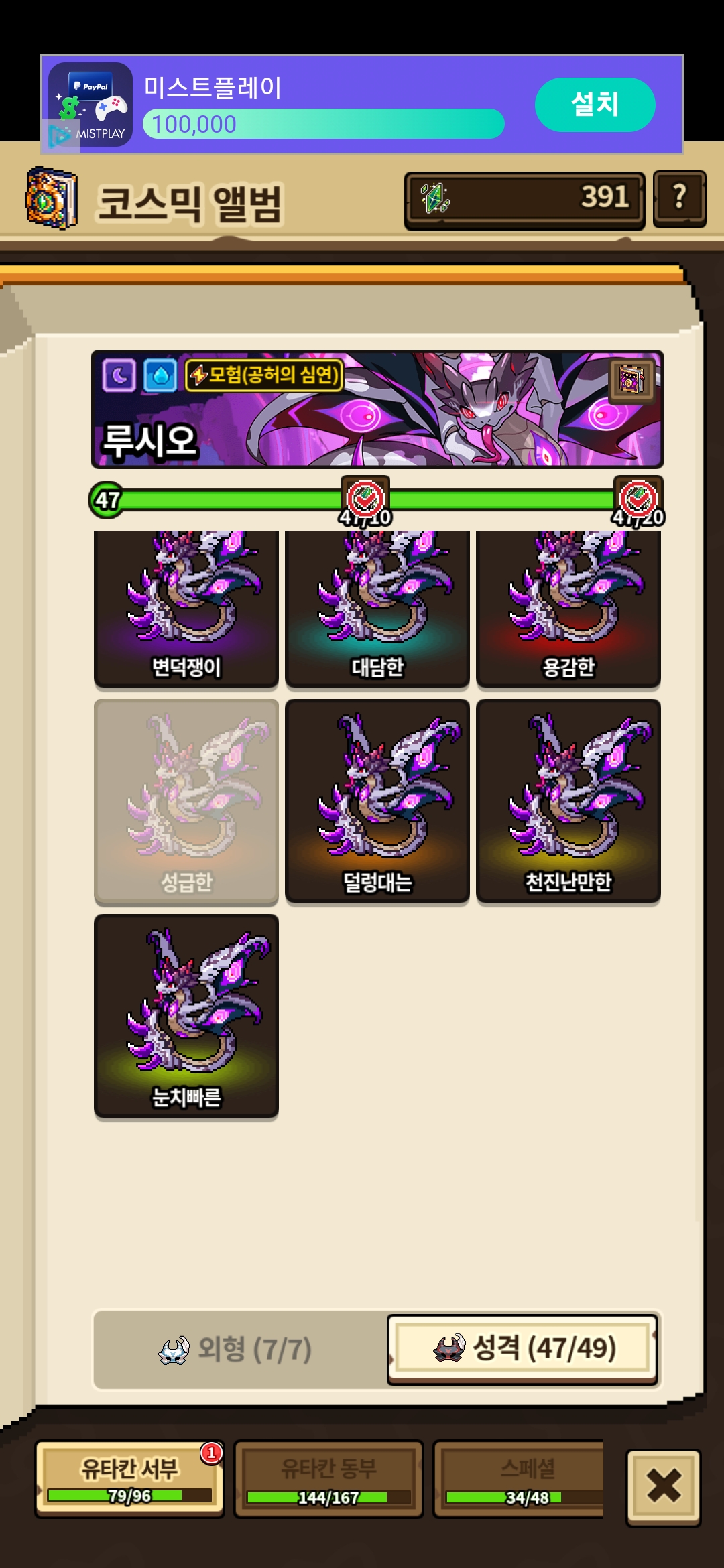 루시오 코스믹앨범 성격에 명랑심약성급 3개 남았는데 47/49면 2개 남은거 아닌가요🤷♀️ 당황스럽네