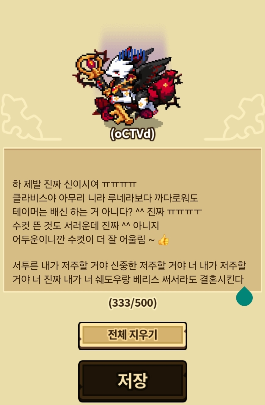 서투른 패치 언제 되냐고 언제 되는 건데 나 아니 ㅎㅏ 너 진짜 클라비스랑 루네라 저주할 거야 루네라 승천시켜버리고 싶네 월네라 투정 다 부리니까 이제 루네라 중2병 슬슬 오기 시작했나보네 ㅎㅏ 승천시켜버리고 싶다 (근데 매니아땜에..) 아 진짜