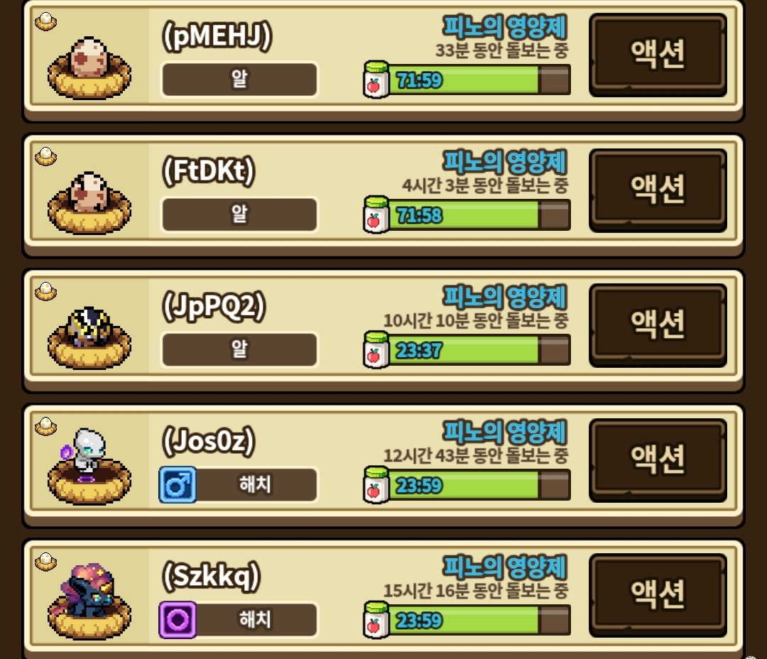 나름 열심히 한 무과금이라 3개월인데 성체수 400 조금 넘긴 합니다. 이번 이벤 때문에 여태 쓴 적 없던 에그 특능들에 모아둔 피노의 영양제에 거래소에서 얻은 야누스도 키워내고 있어요.