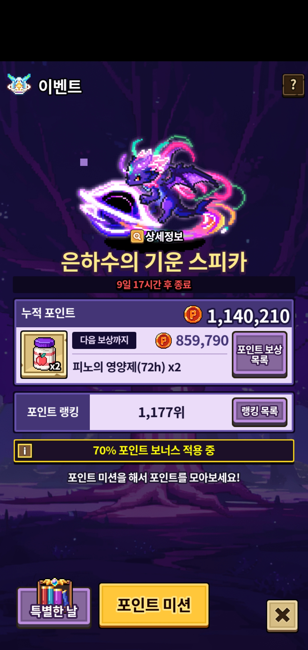보너스용 더키우는 중인데 영양제도 못받았으면 블랙홀까지는 가지도 못할것같네요 여러분들은 블랙홀까지 꼭 가세요!
