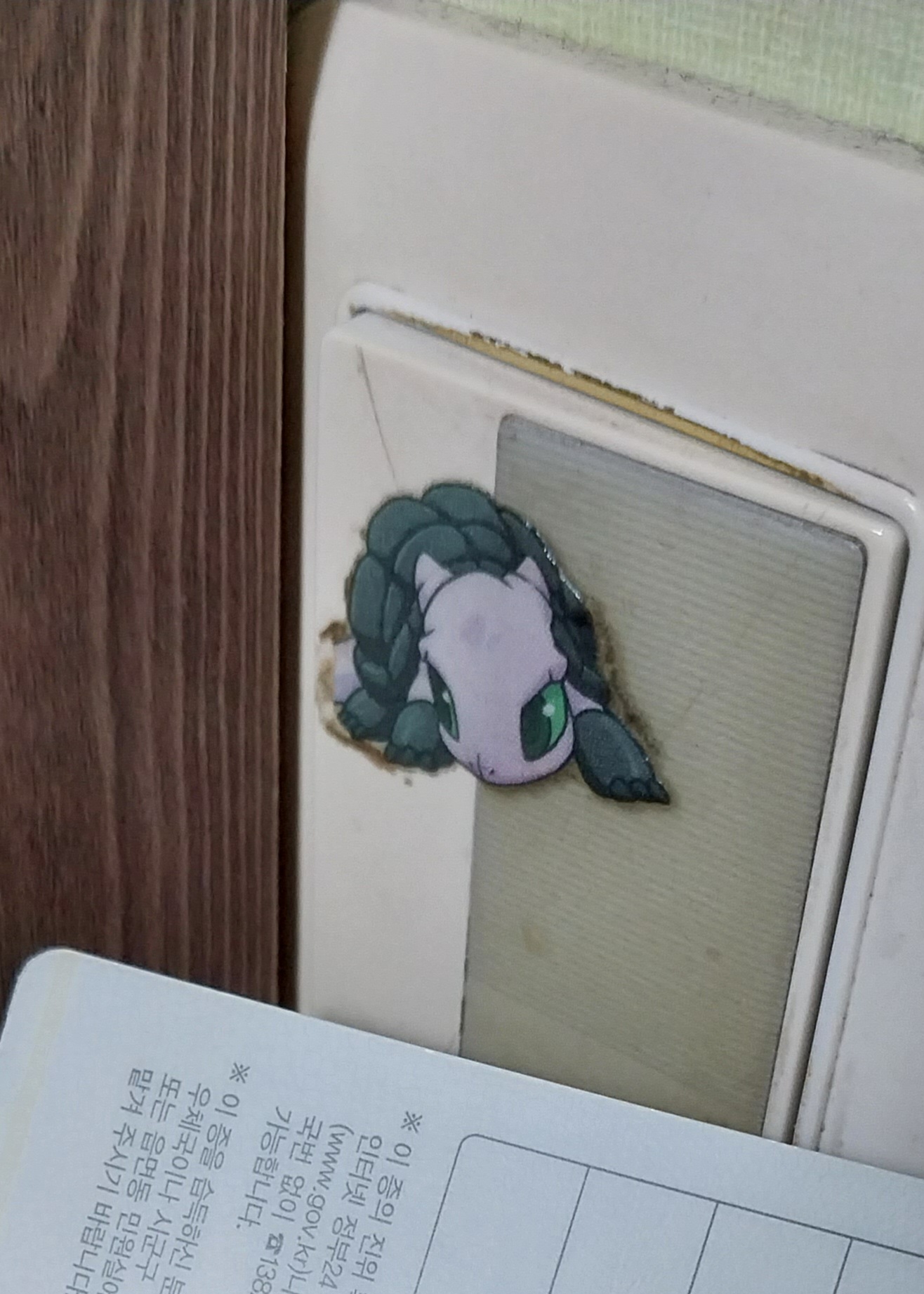 사진에 있는 스티커는 예전에 카드팩으로 판매된 몇탄인진 모르겠는디 카드에 띠부씰처럼 들어있던 그 띠부씰의 스터드 드래곤인가 그렇습니다…엄지 손가락만해요..한 5년 정도 전에 붙였던걸로 기억해요