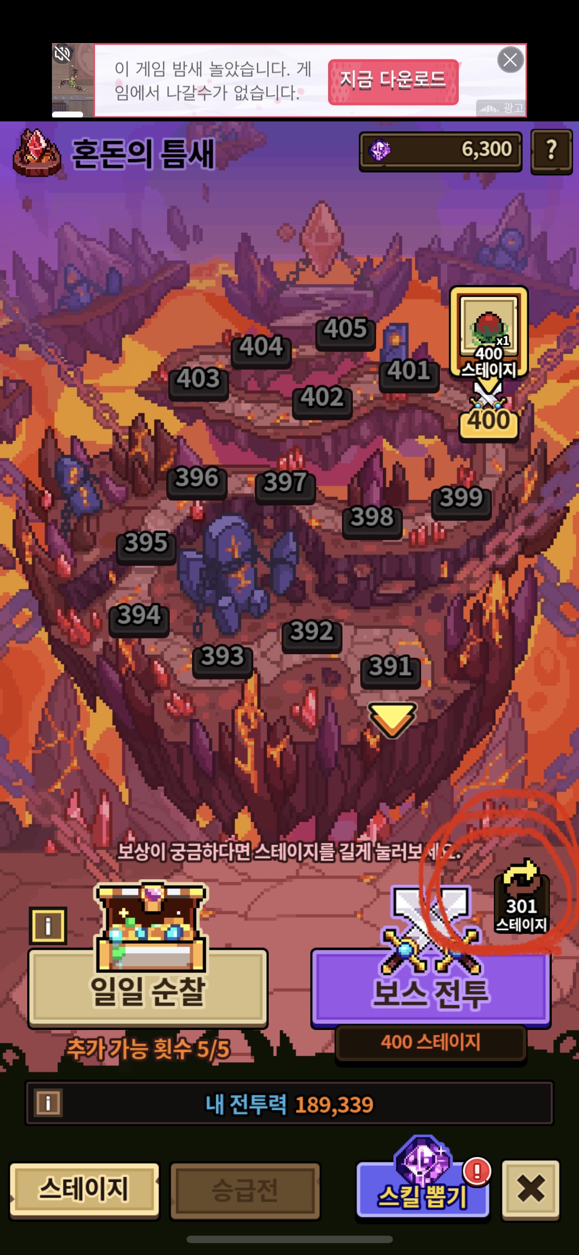 빨간 동그라미 친 버튼 누르면 바로 다음 보스 스테이지 도전 가능해요