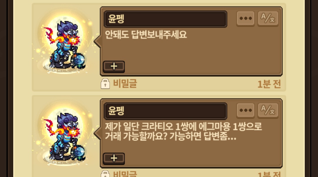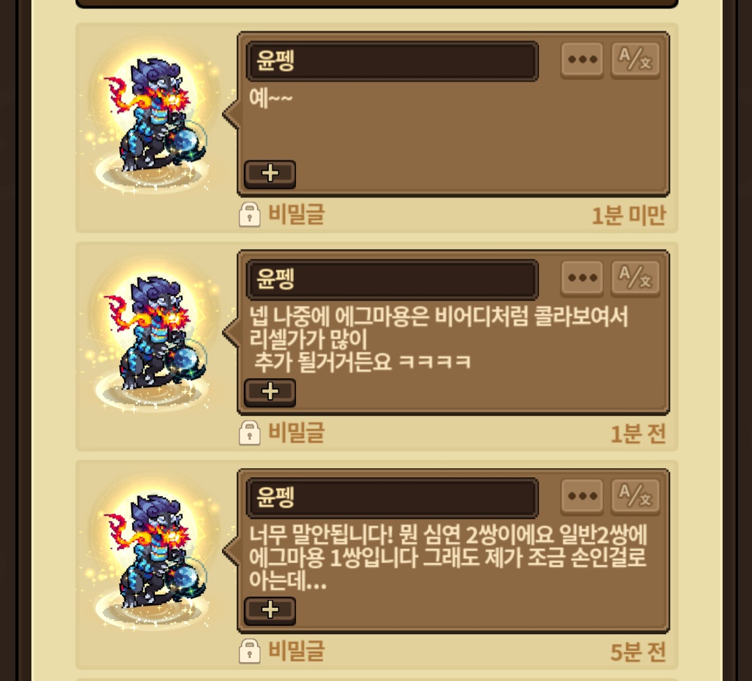 그래서 내가 혹시나 싶어 심연 클라 한쌍이냐는 식으로 물었고 내가 그정도 가치 제안이라고 했잖아.. 에그 리셀 개뿔..ㅋㅋ 나 에그만 5마리 넘고 다야만 만개가 넘는다..;;