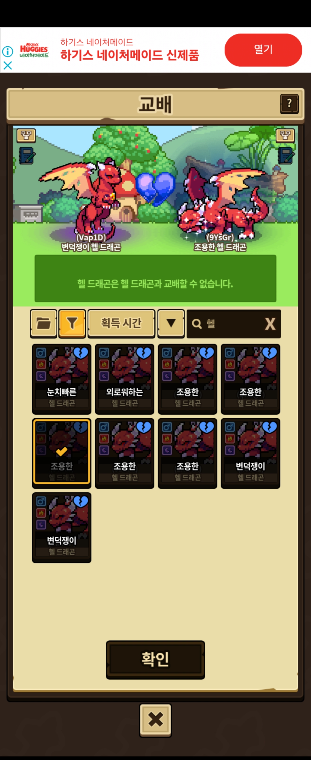 하아 심해 업데이트 되고 나서 보호소에 헬 드래곤이…없어져서..내가 가지고 있는 헬이라도 교배해서 매니아 딸려했는데 아니 뭔 교배가 불가능..(물론 헬드래곤+딴 드래곤은 가능/난 순5 만들고 싶었음)아 진짜ㅏ… 미치겠따ㅏㅏㅏ그냥 그 뭐냐 아쿠아 드래곤이나 매니아작 할까..