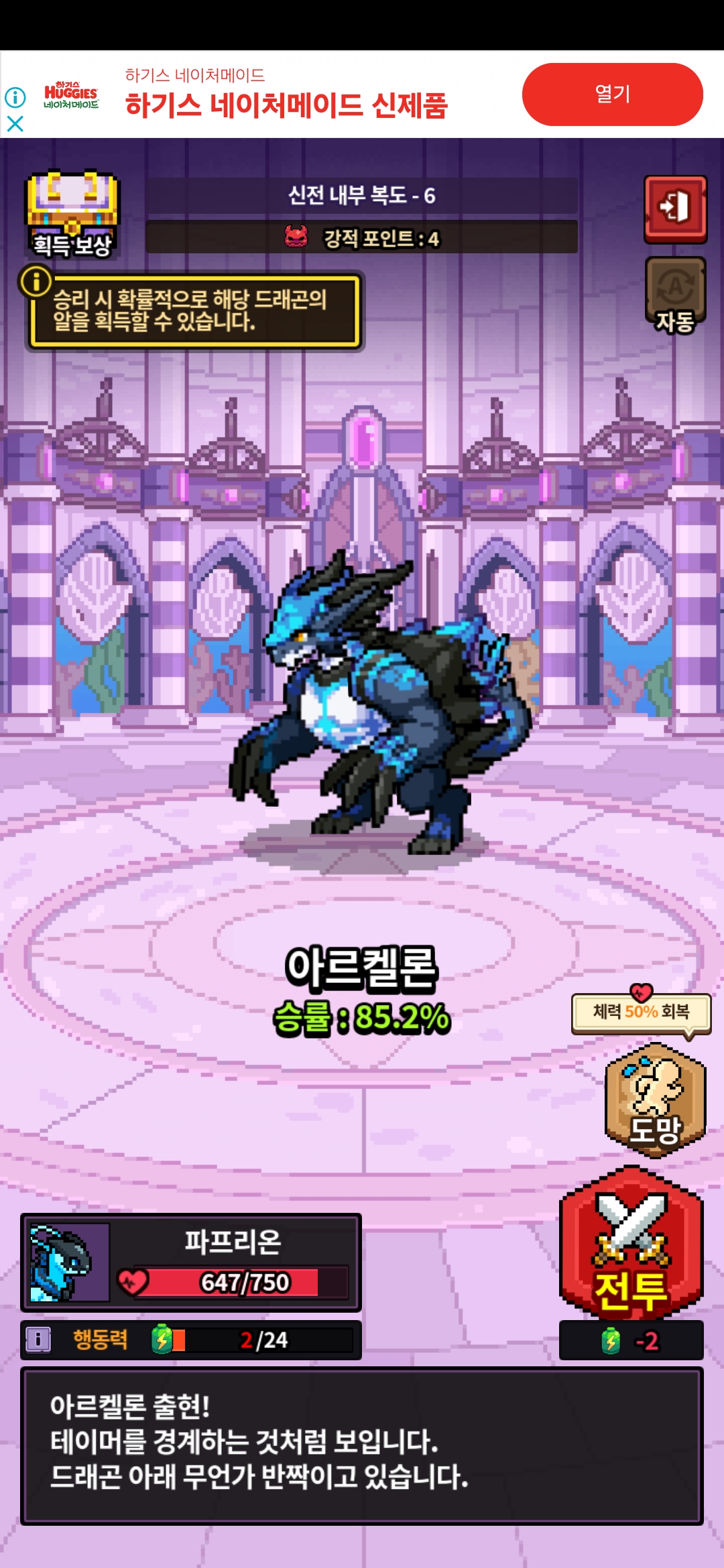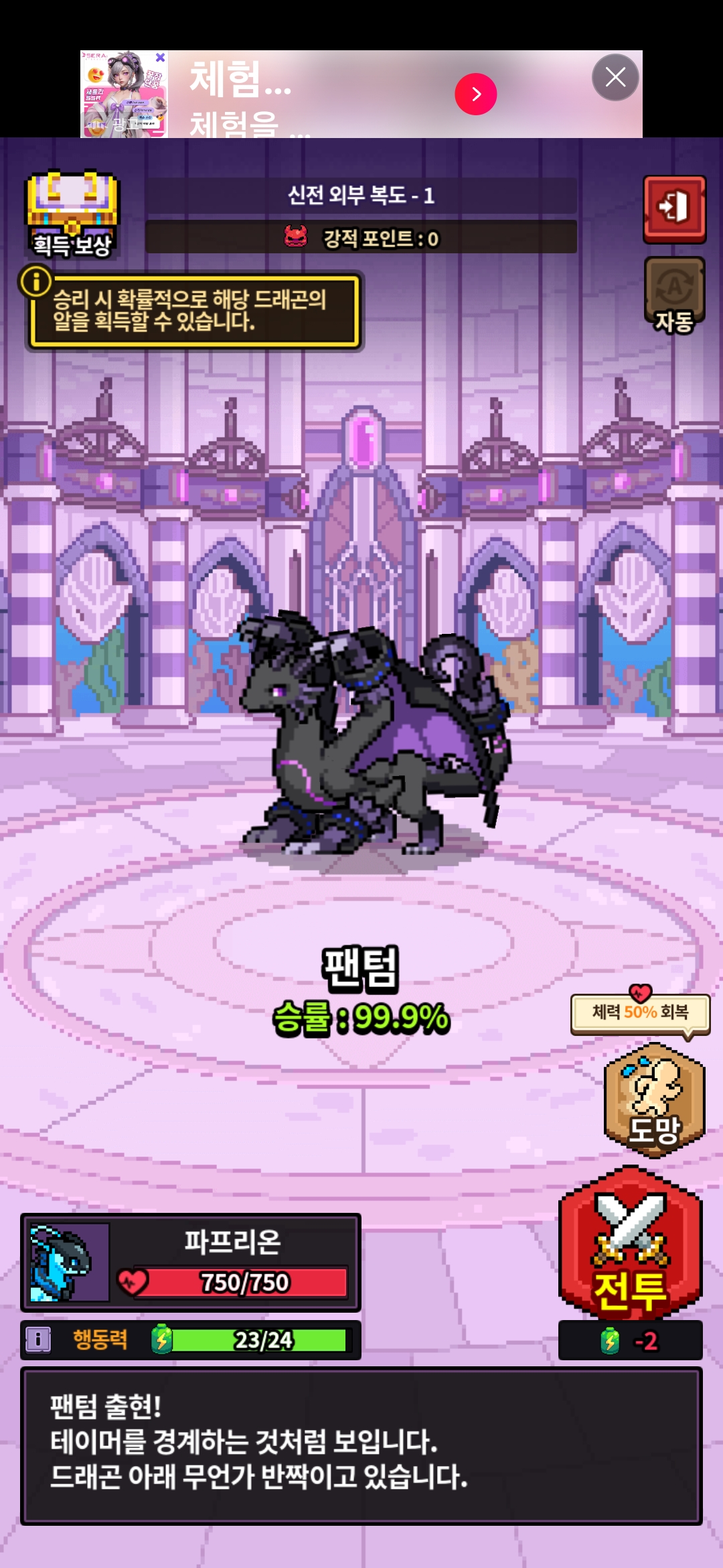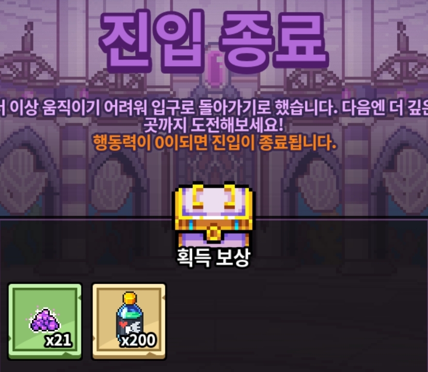 팬텀(한 걸음 가자마자 나옴, 드링크) → 뭉게(가루) → 팬텀(드링크) → 뭉게(도망) → 아르켈론(가루)