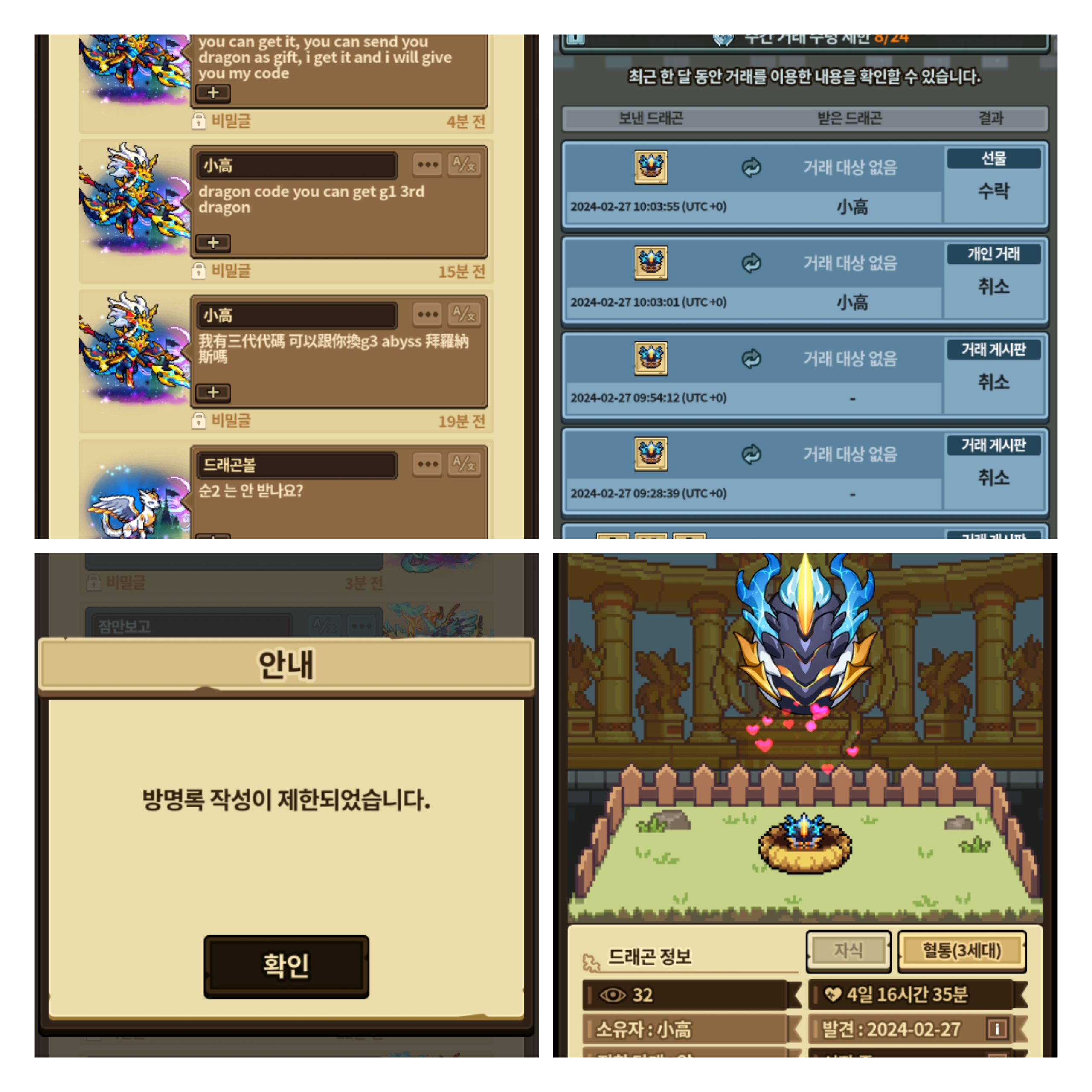 유저 小高 가 방명록으로 심연바루나스를 선물로 보내면 3탄 코드를 준다길래 선물로 보냈습니다. 보내자마자 자기가 쓴 방명록을 모두 지우고 절 차단했습니다. 코드 역시 받지 못했고요, 사기 많이치기로 유명한 유저 같던데 아직까지도 이짓거리 하는거 보면 재제를 안 하나요?