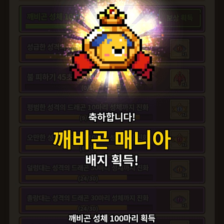 1번째 강강, 2번째 에그에 이어서 3번째로는 깨비곤 매니아에 달성했습니다~( ⸍ɞ̴̶̷ ·̫ ɞ̴̶̷⸌ )♡