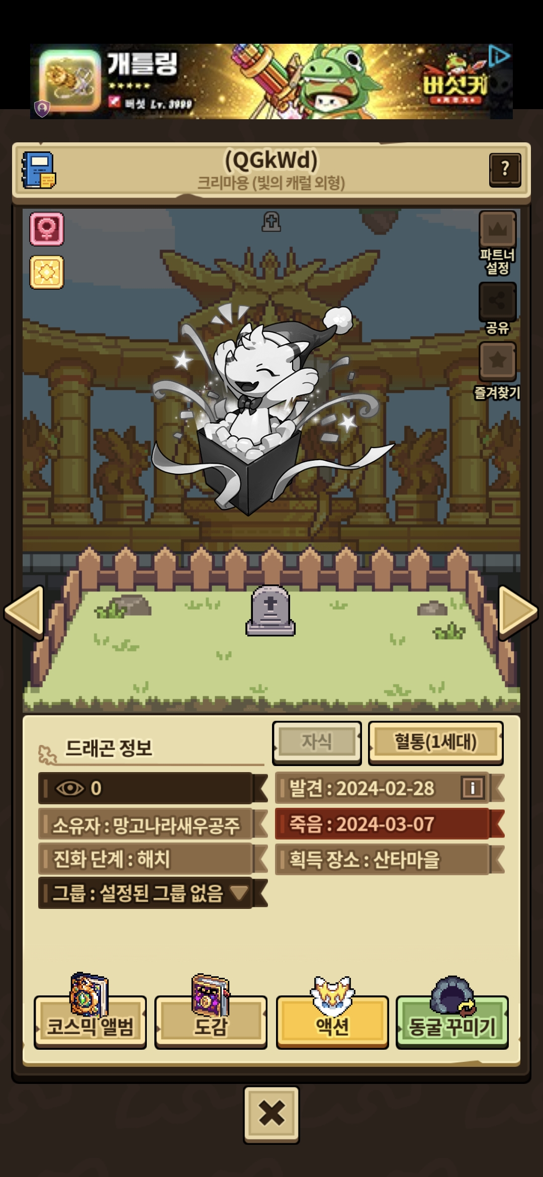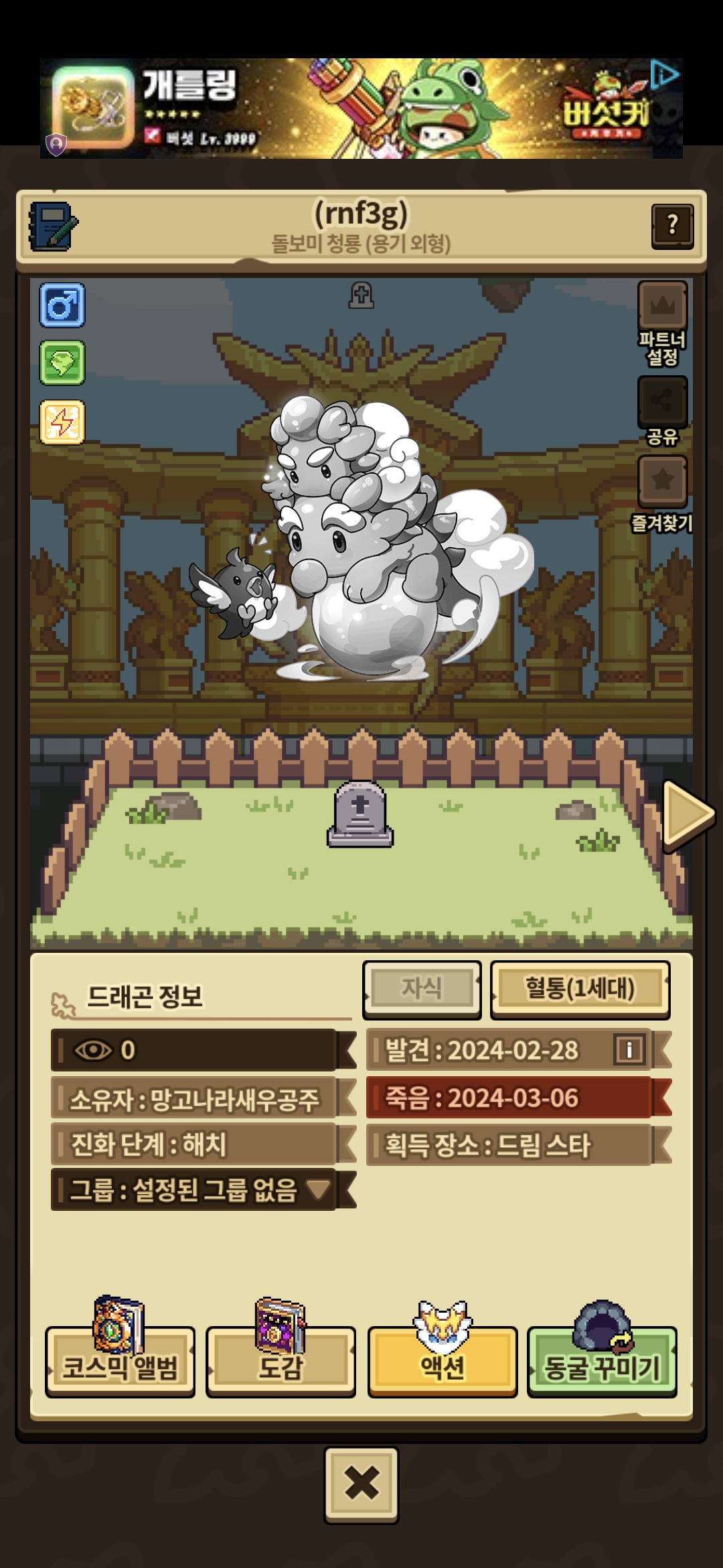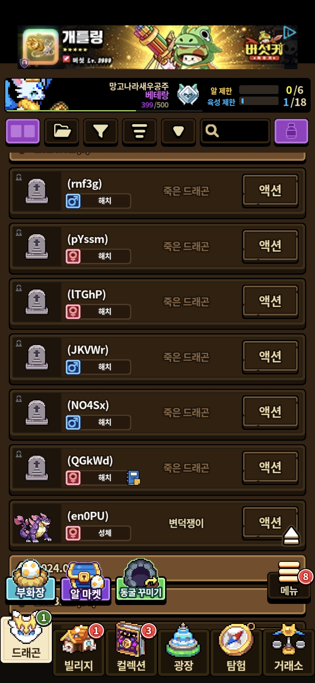 소홀히한 제 탓이죠.. 참.. 청룡 저녀석 얻겠다고 이벤트 끝나는 전날 새벽에 하루만에 했는데.. 빛의 캐럴 외형 아무리교배해도 밤밖에 안나오던 녀석들 꾸역꾸역키우고…포인트로 산 녀녁 이었는데….. 맨날 고민하다 안들어와서 미안하다 곤뇽들아…