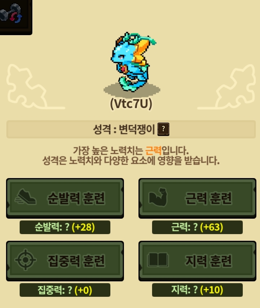 근력만 올리면 되겠다 싶었는데.. 왜 안나오나 했더니 지력이랑 순발력이랑 15 이상 차이가 안 나네요..