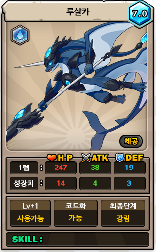 거대한 체구를 자랑하는 수호자 드래곤. 웨일 드래곤은 깊은 바다에 서식하는 보기 드문 희귀 드래곤이다. 보는 것만으로 행운을 가져다준다 하여, 블루 럭이라는 큰 몸집에 비해 다소 귀여운 이명이 있다.