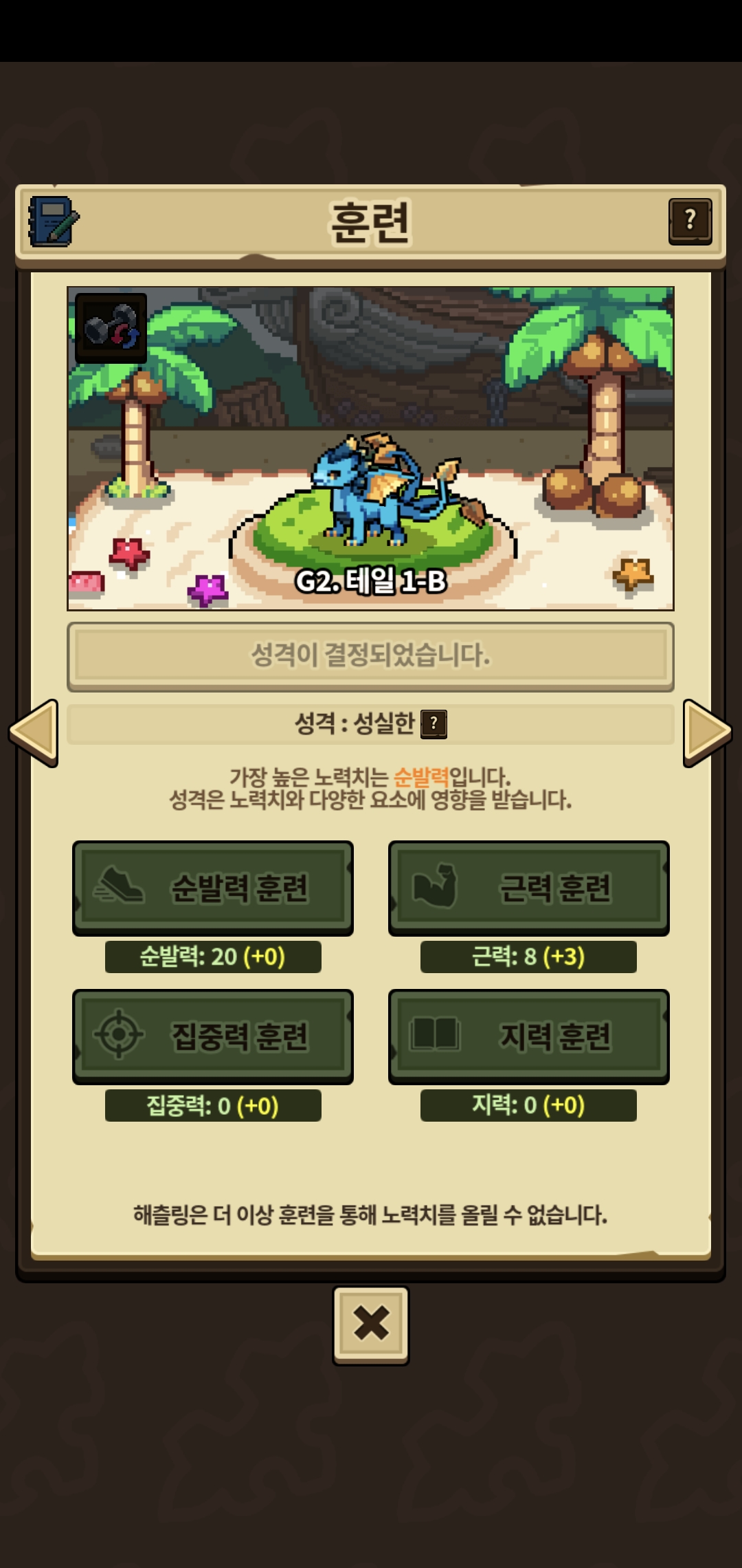 그러고 나서 성격도우미 업뎃 이후로 조건이 바뀌어버린 외로워하는 성격 방지로 근력 3 올려줬어요.