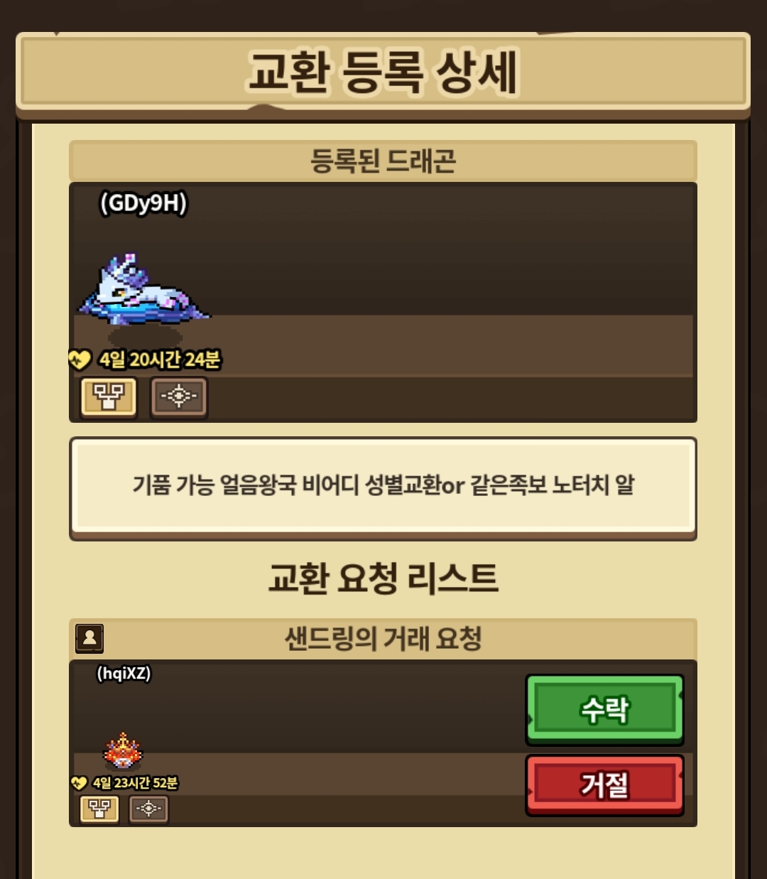 그리고 18일 점심 즈음 제 얼음왕국 비어디가 남아가 떠서 여아를 원했던 저는 성별교환이나 알로 바꿔달라고 거래를 올렸고 제시가 오지 않아 그 후로 약 몇시간가량을 방치해뒀습니다. 그리고 조금 전 오후 즈음 제시가 들어왔는데 비어디길래 족보를 확인했더니 어느 모로 보나 얼음왕국 외형이 뜰 수 없어 의아해하며 닉네임을 확인했더니 같은 분이시더군요.
