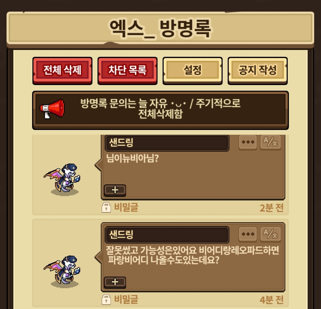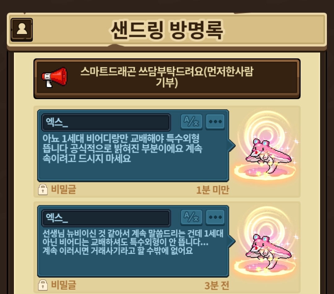 설명을 드렸더니 말을 바꾸시더군요. 애초에 부모가 비어디와 레오파드도 아니었고 미트라와 잡비어디였습니다. 그래서 마지막으로 다시 설명을 드리고자 했더니 제 방명록도 다 지우고 차단하셨네요.