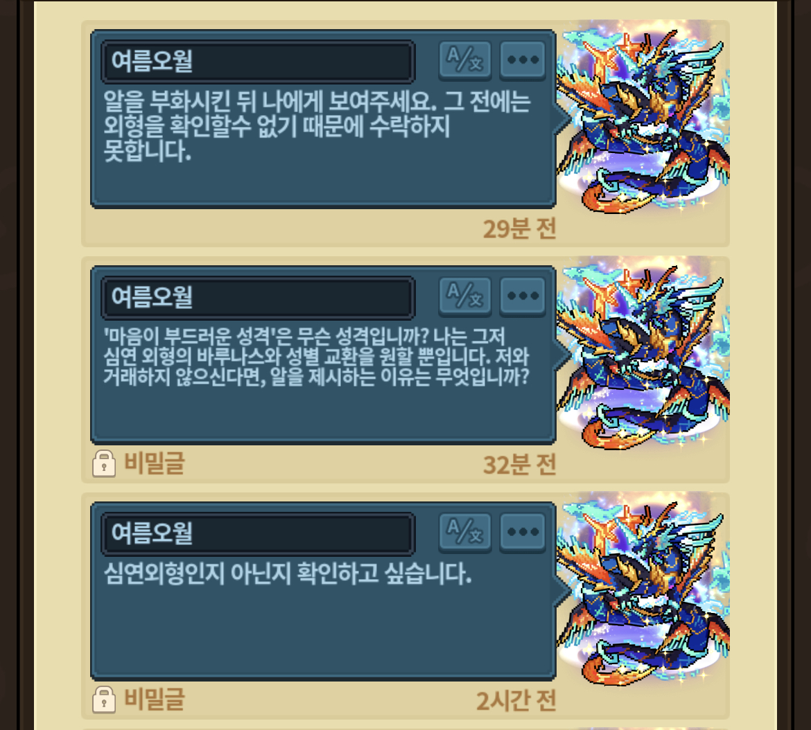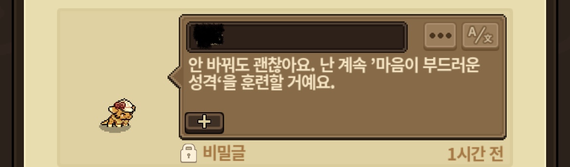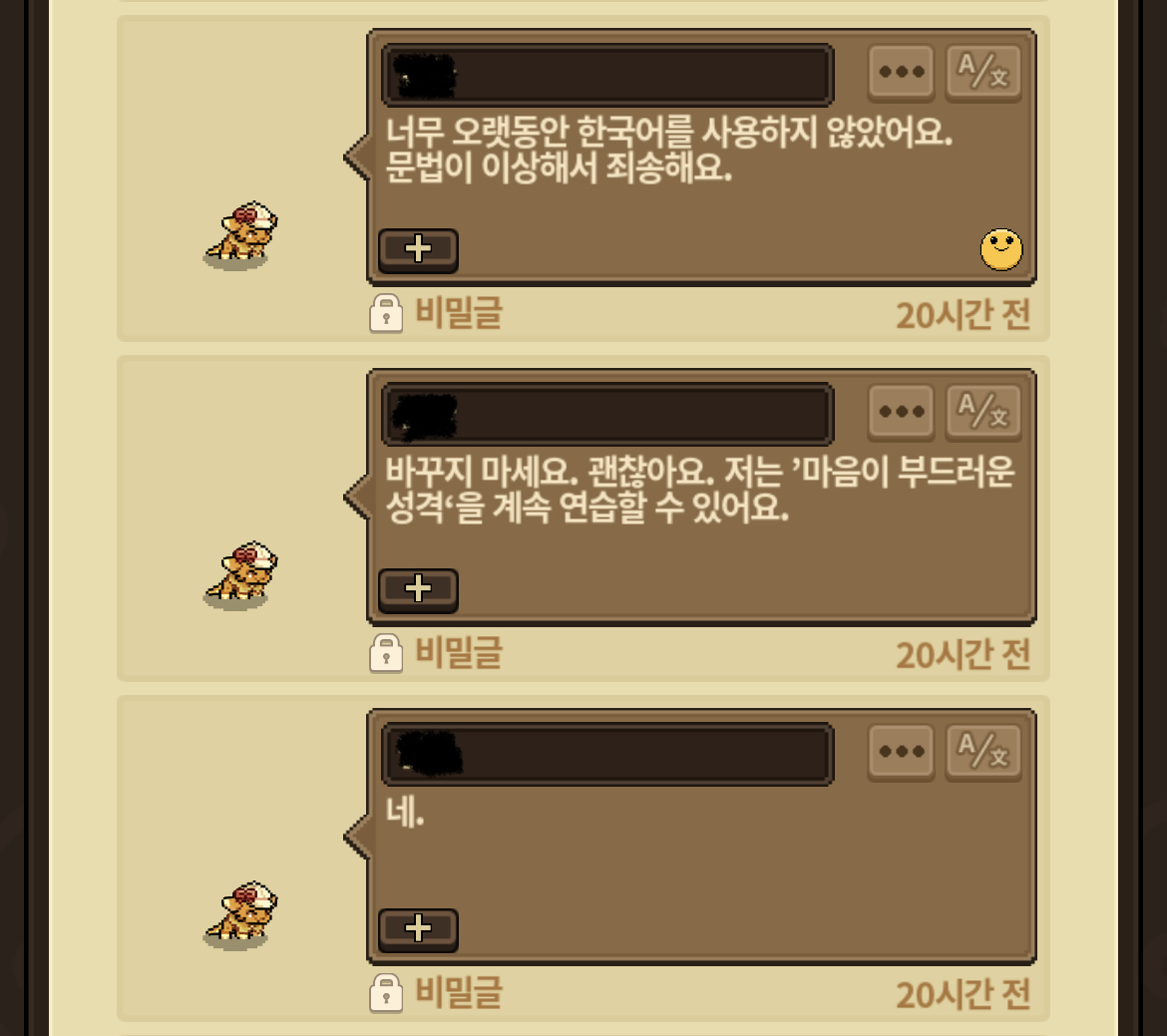 그런데 분명 한글 두글자로 이루어진 닉네임에도 불구하고, 마치 번역기를 돌린 듯 어색한 어투로 “마음이 부드러운 성격”을 훈련하신다며 괜찮다고 하셨습니다.