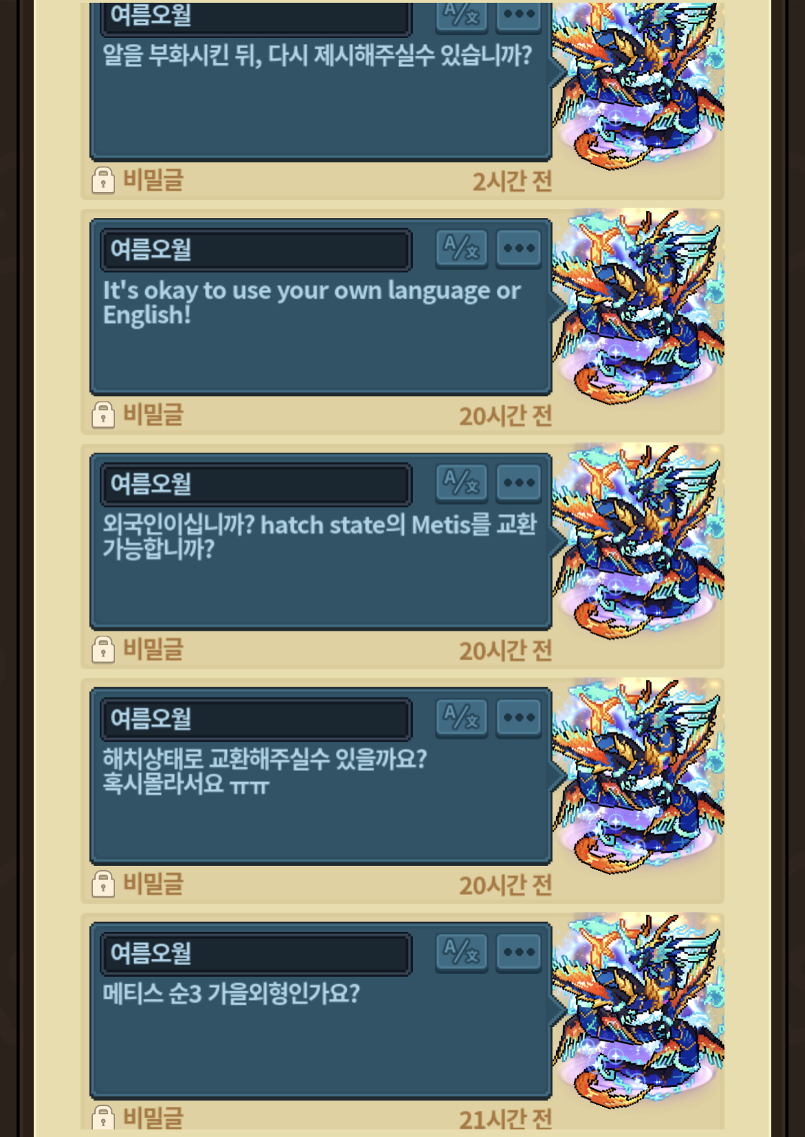 명록으로 드링크 제시 혹은 거래소 제시를 받던 도중, 똑같은 일본어애칭족보 순3 ‘알’을 제시해주시길래, 최근에 외형사기를 당할 뻔한 적이 있어서 해치상태로 거래를 요청했습니다.
