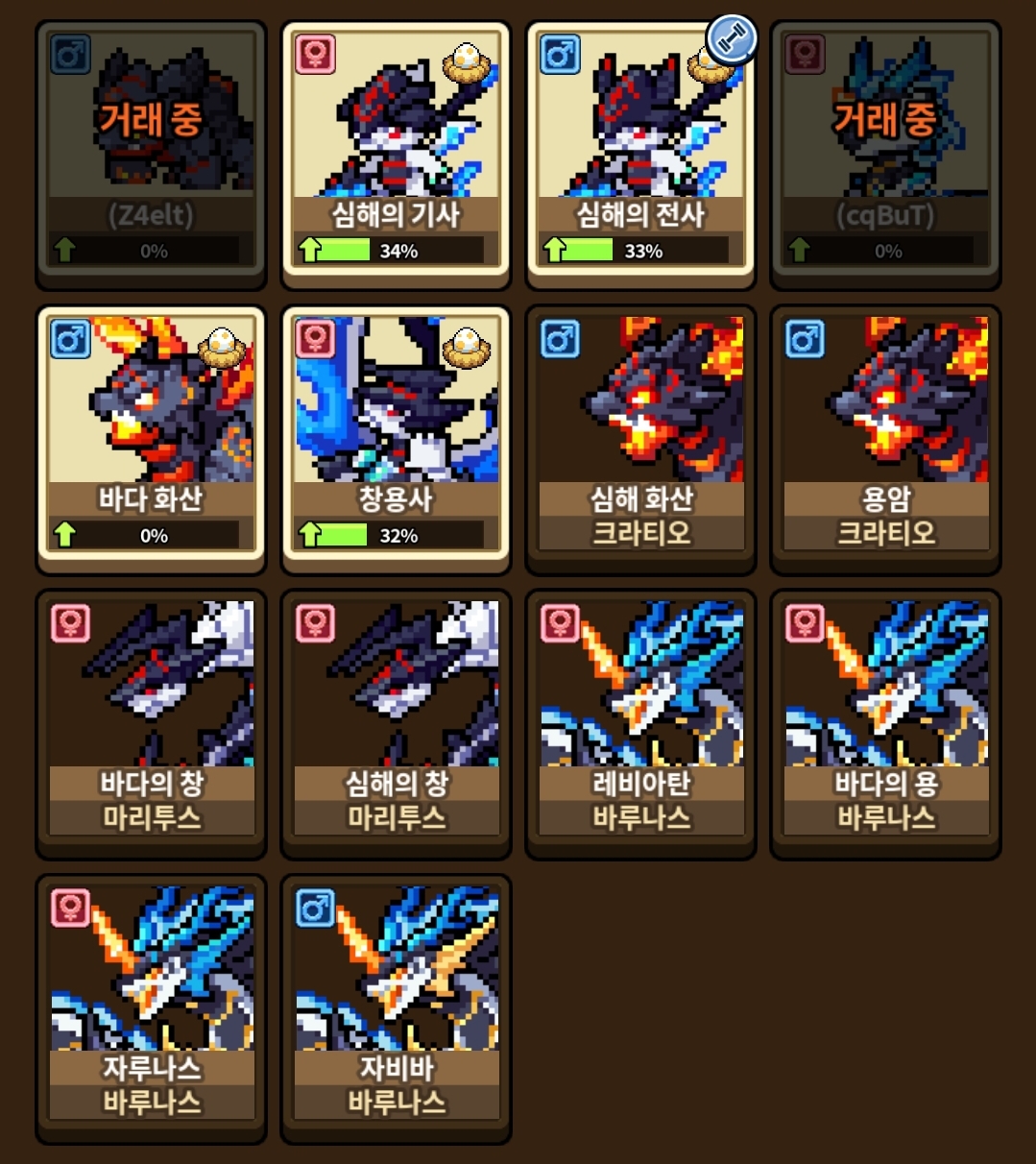 어떻게 이럴수가 있죠!!! 전부 성비가 같은 아이만 태어나요 ㅜㅜ 더 어이 없는건 저기 같은 종에 다른 성비 보이죠? 저거 교환이나 구매한거예요…. 다른 성으로 태어난 적이 1도 없다고요!!!! 거래중인 2녀석도… 성별교환 준비 중인데 거래가 안잡히네요…. 제발 그만해!!!!!