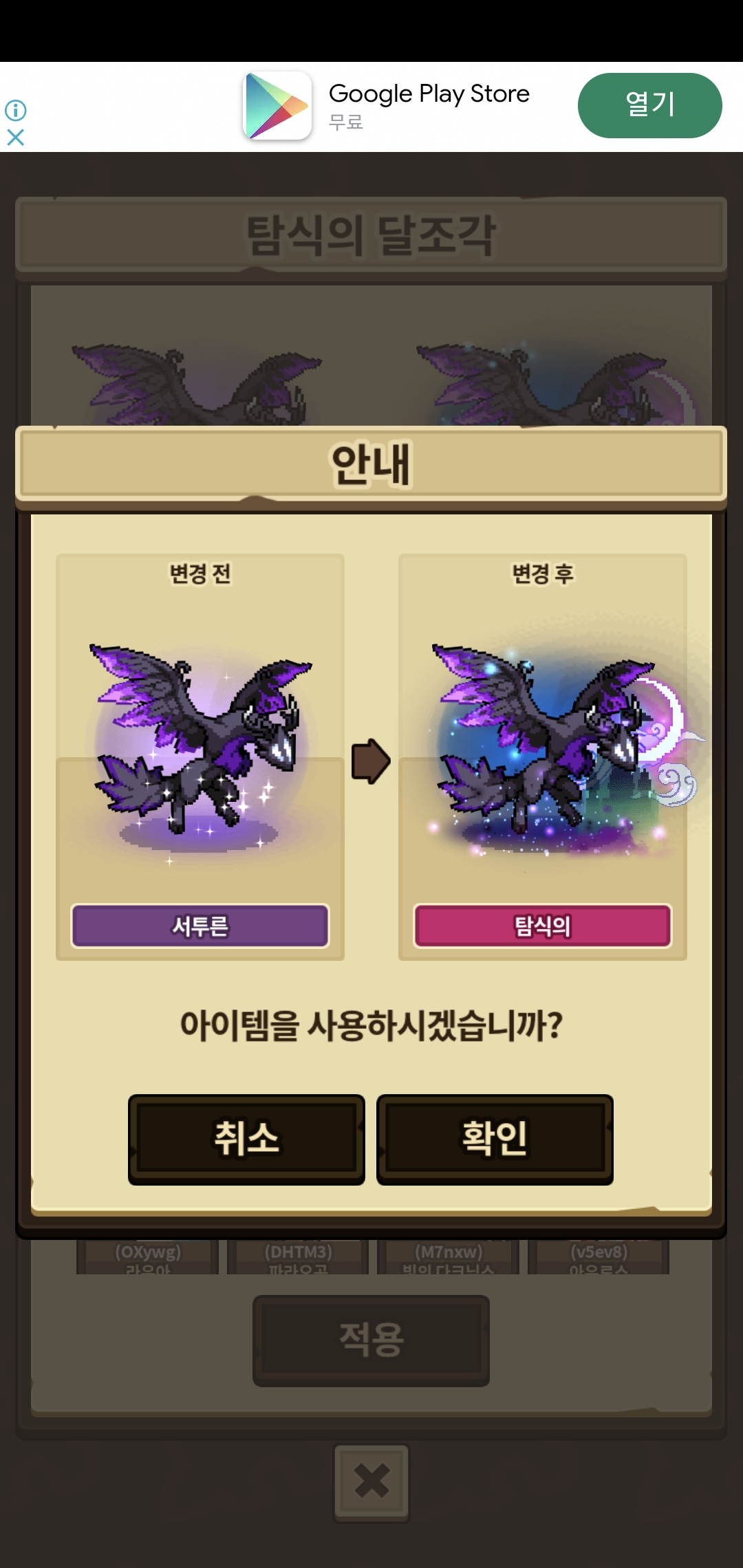 희귀한 드래곤 프로즌(페르시온 외형)을 얻어 탐식의 달조각까지 먹여주었습니다