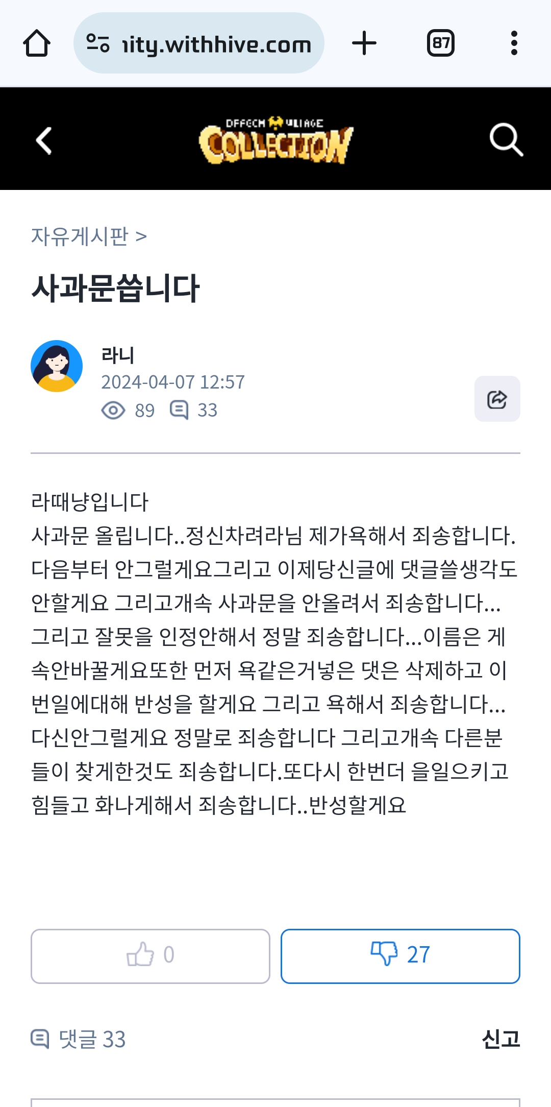 이 새!#!#끼는 사과할 마음이 없음. 지가 뭔 잘못 했는지도 모를걸? 그냥 개무시하자. 이딴 잼 하나 때문에 시간 쓰는거 아까움. 근데 또 지!!@랄 발광함 우짜라는겨 ㅋㅋㅋㅋ