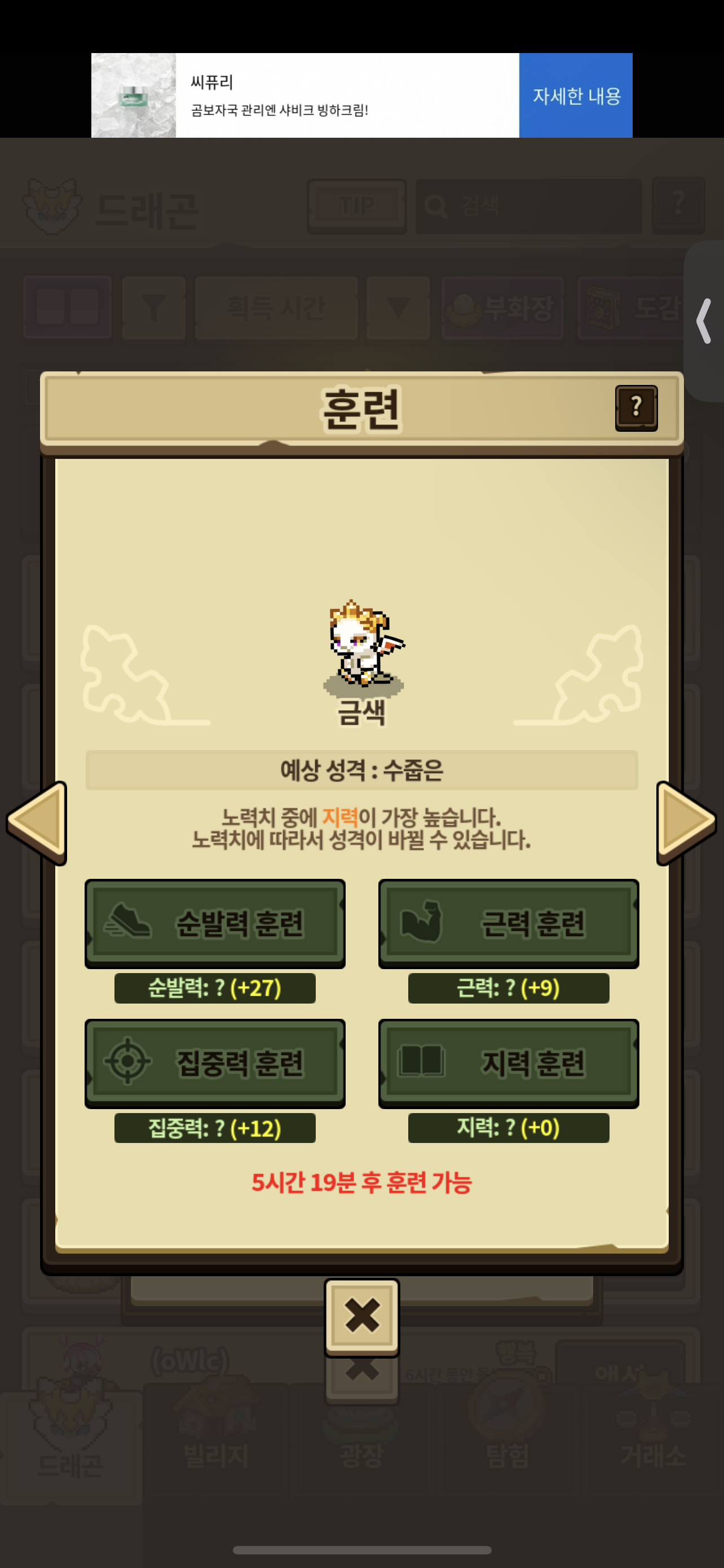 지력이 가장높아 지력제외하고 훈련진행했는데 도중에 수줍음이 등장했습니다~