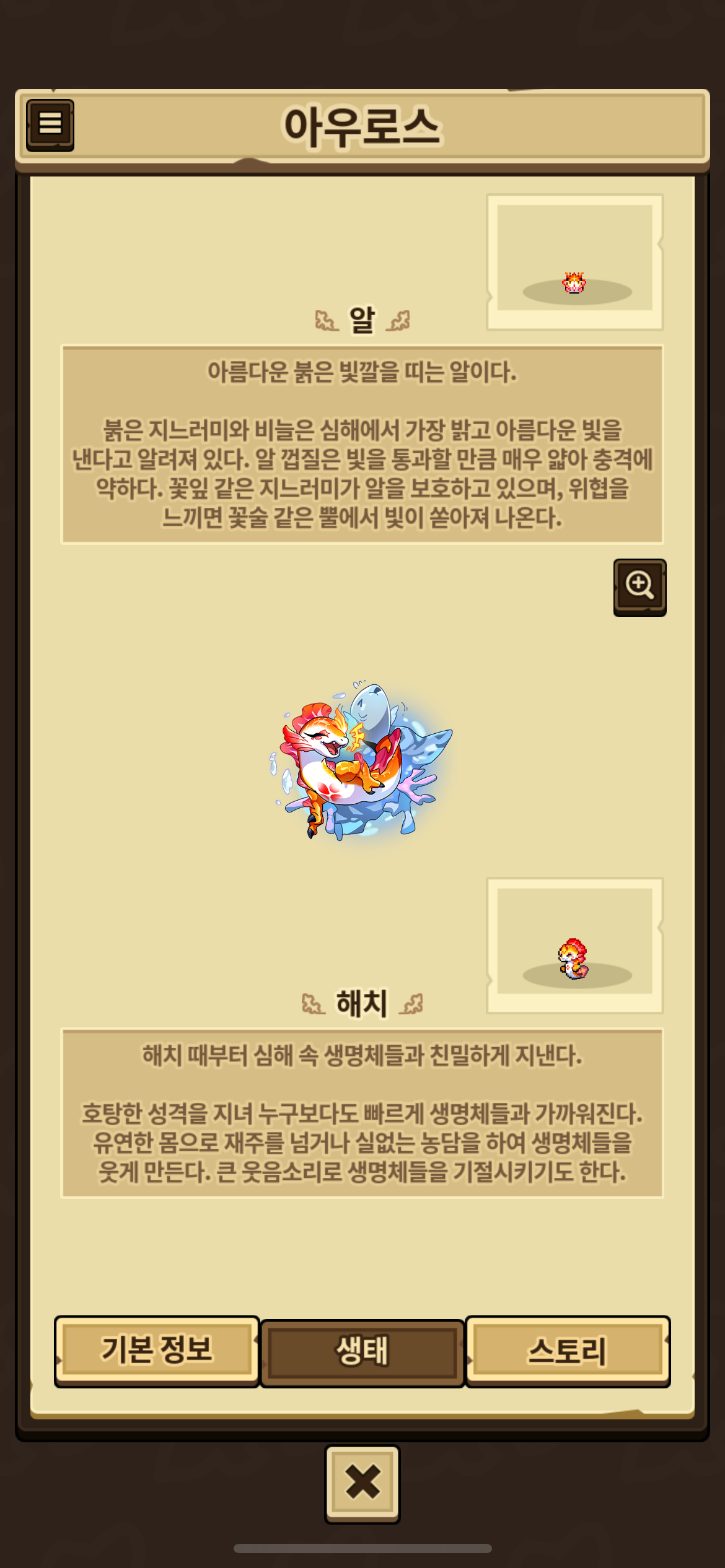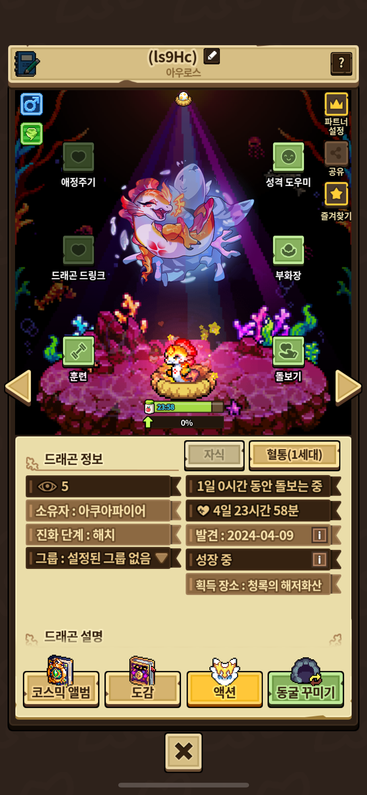 심해 설화 업데이트 이후 해저화산 100마리 진화 업적 달성도 할겸 네시랑 아네모네 팔고 아우로스 키우기로 했네요