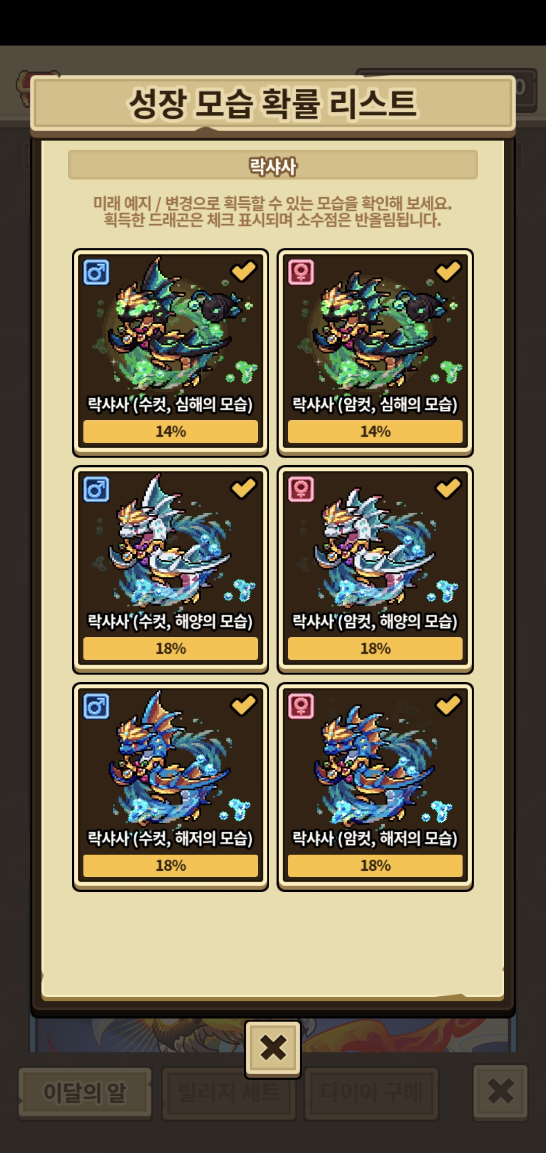 가챠를 엄청나게 싫어해서 처음 가챠 컨텐츠 생긴다고 했을 땐 진지하게 접을까 고민하기까지 했는데 이정도면 딱 좋은 것 같아요. 다른 가챠들처럼 확률이 0.n%라는 개시발 말뼉다구같지도 않은 확률 장난질을 치지도 않고 비교적 적은 비용으로 재굴림까지 가능한데다 종류도 6종으로 많지 않아서…