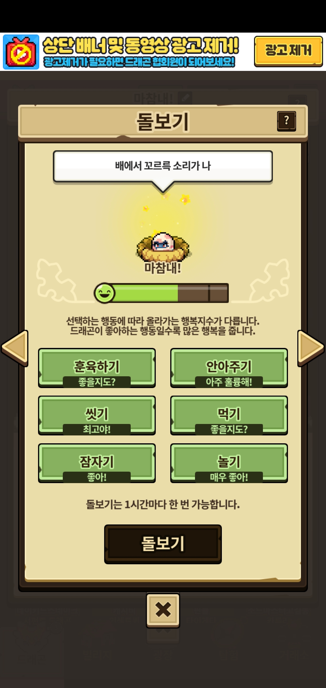 행복 지수 0일 때는 높게 올라가는 걸로 풀게이지 채우고 나중에 떨어질 때마다 낮게 올라가는 돌보기를 시켜서