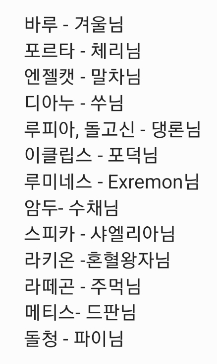 이름은 제가 간단히 적었습니당! 너무너무 늦어버렸어용..죄송삽니당…순서는 쓴 순서입니당! 룰렛으로 나온 순서라 의심 없으셨음 해요! 늦어서 너무 죄송합니당.. 그리고 관심 주셔 감사합니당!