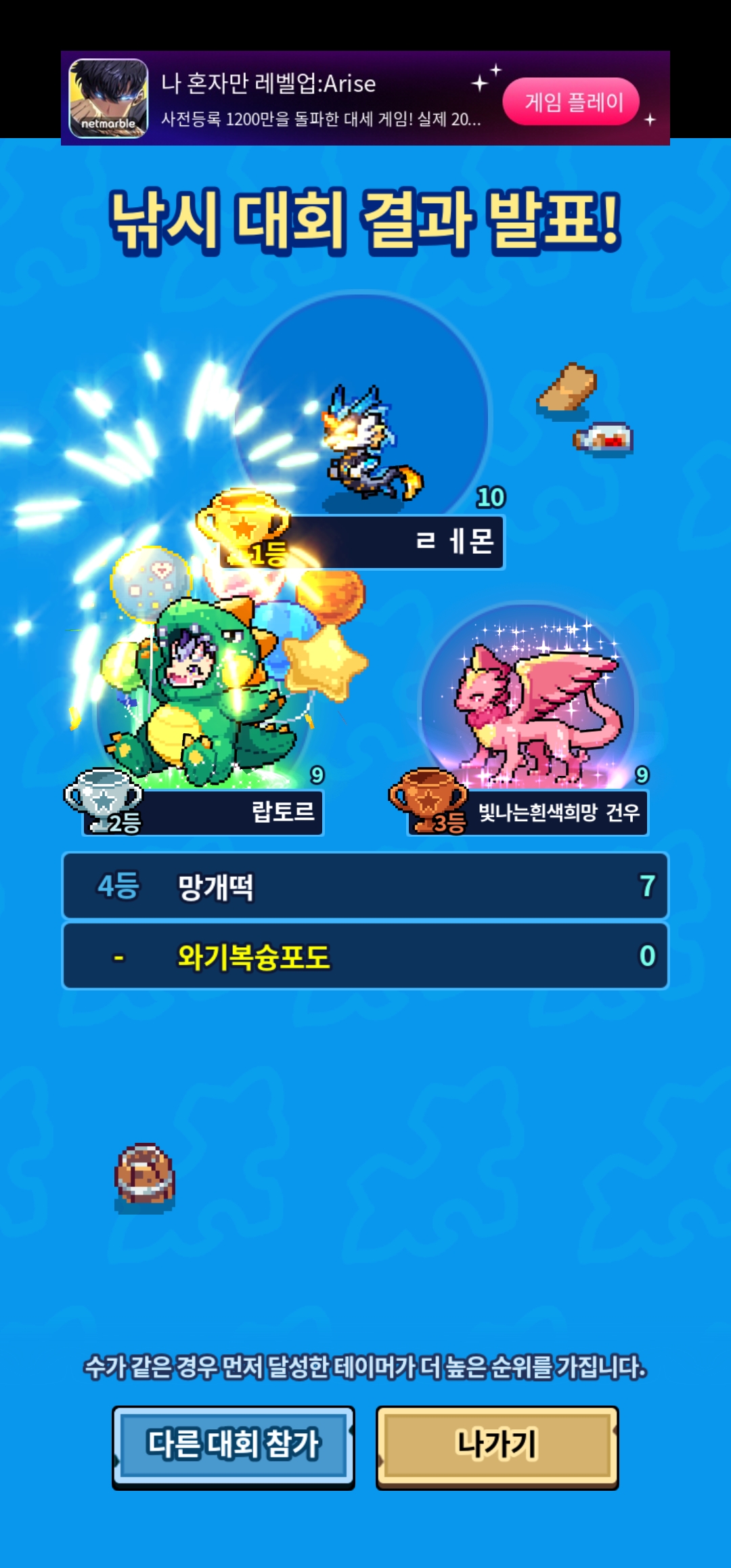 공지에선 10분까지 기다리고 대회 시작한댔는데 실수로 채팅버튼이 아닌 시작버튼 눌러서 3분에 시작했습니다 ㅎ하하