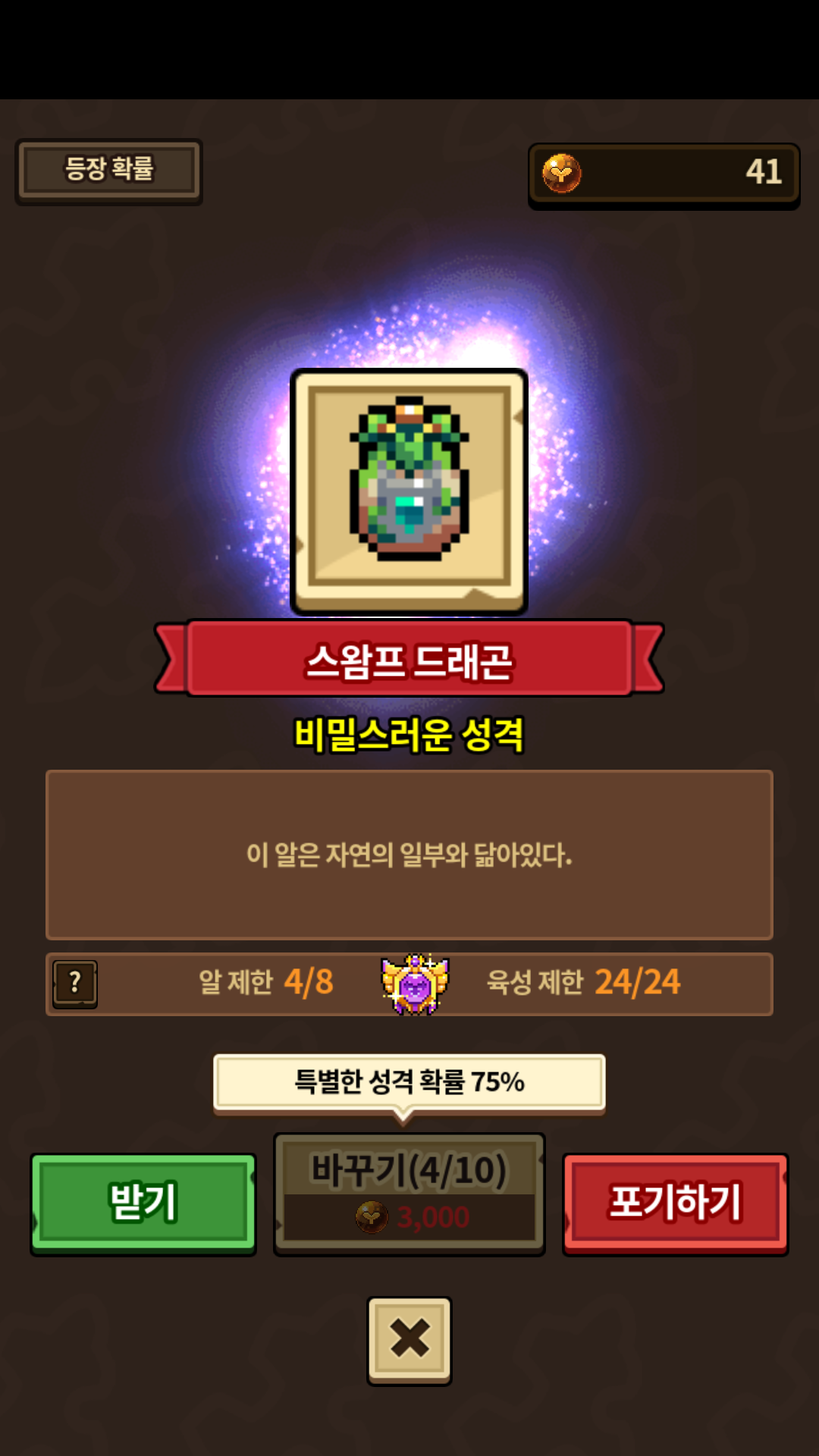 6회차 변경까지 했습니다. 하면 할 수록 흔한 알들(스왐프 포함)의 등장 확률이 낮아지는데 비밀스러운 성격까지 붙어 나와줬네요.