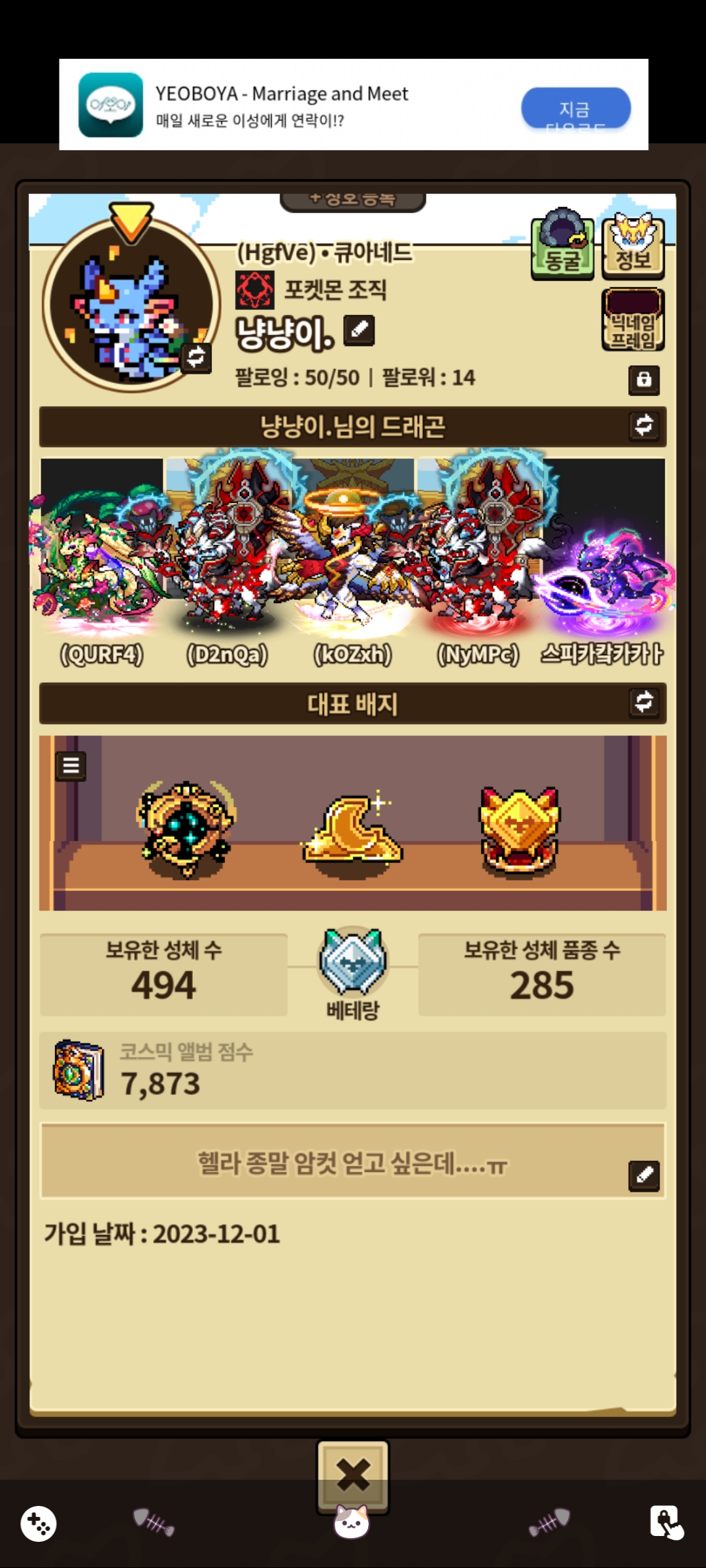 저 마스터 될려면 6마리 더 얻어야 하는데 업적에서는 500마리 모았대요…..