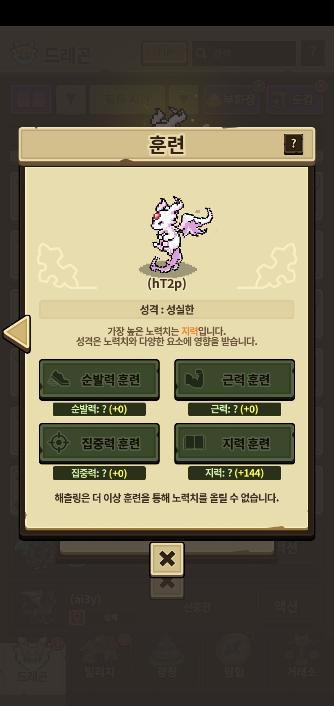 5마리째 최고치가 156넘는 개체인것을 확인 했지만 성실함밖에 뜨질 않습니다. 돌보기x 질병x 마지막 해치>해츨링만 애정주기했습니다.😂 현탐오네요.