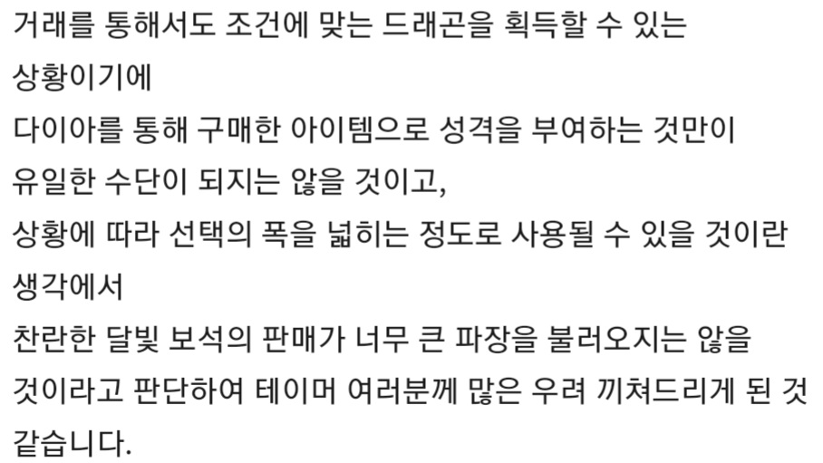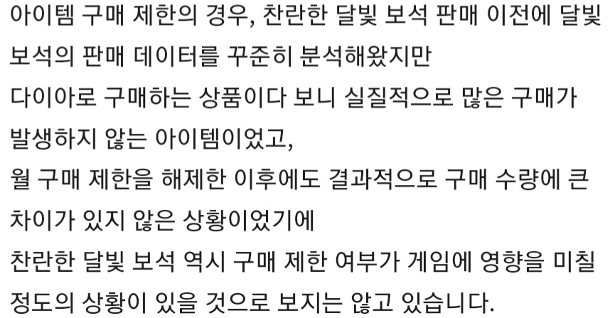 →당연히 제한을 풀어도 실질적으로 구매가 많지 않았겠지. 350다이아나 했는데. 어떤 정신나간 얼간이가 이달용보다 비싼 돈을 주고 그걸 사겠나? 그리고 찬란한 달빛보석의 구매 제한 여부가 영향을 안 미친다? 원하는 성격을 조건 없이 부여하는 능력이면 돈만 있다면 개나소나 다 사려 하지 않겠나? 그걸 바라고 굳이 필요 없다는 걸 만들었다는 걸 누가 모를 줄 아나?