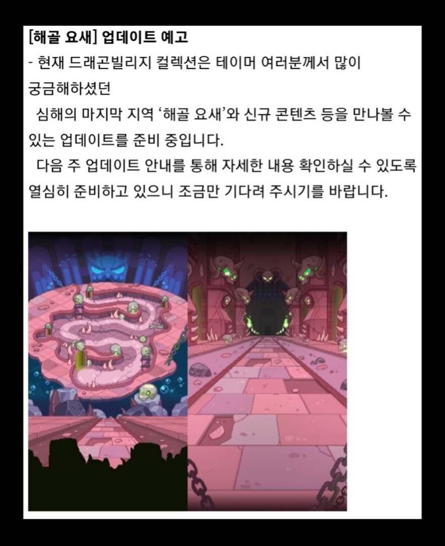드디어 심해 마지막 컨텐츠인 해골요새가 개방될 예정이다. 언뜻 보기엔 혼돈의 틈새나 신전 에스텔라를 섞은 듯한 느낌인데, 자세한 건 후에 봐야 할 것 같다. 설정상 ‘긴나라 드래곤’들이 숨어 들어간 곳이니, 해골요새 보상 드래곤은 아래와 같을 것으로 생각된다.
