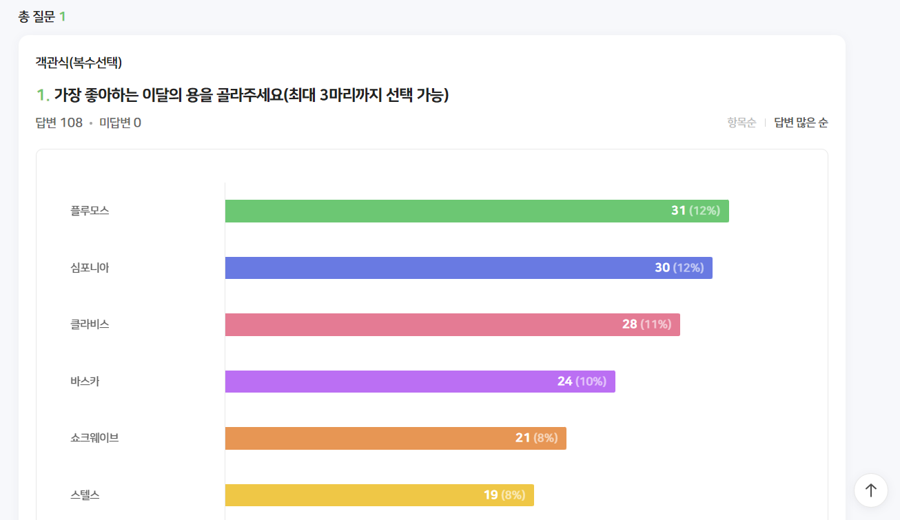 가장 인기가 많은 이달의 용은 플루모스(31표)입니다!