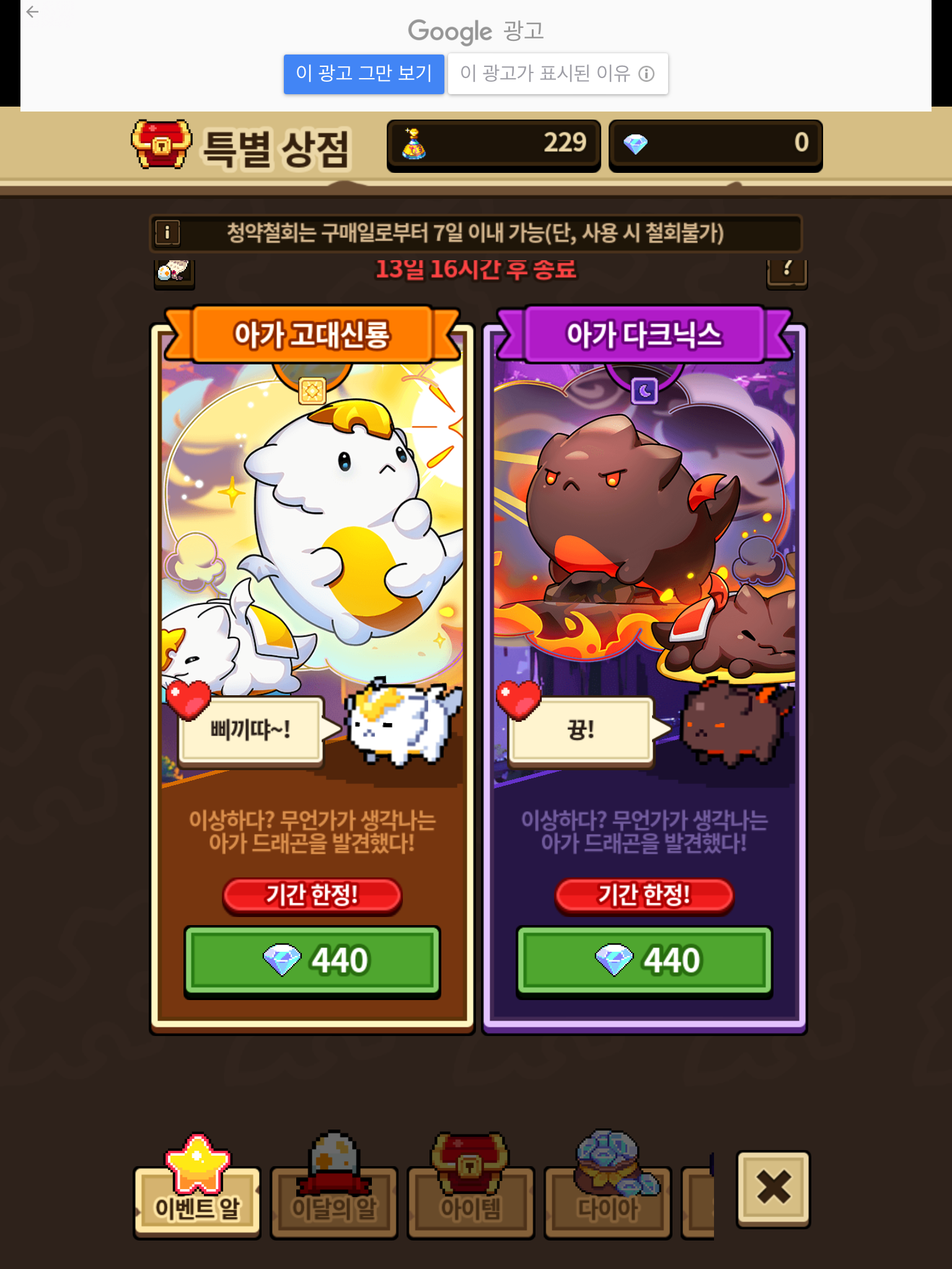 위 사진처럼 유료용이 있는데 팔 때 이달의 알은 출석으로 주기는 하지 저런 이벤트 용은 그런 거 없는데다가 이달 알보다 더 비싼데 돌보미 청룡처럼 이벤트로도 안 주는게 좀 화나네요. 돌보미 청룡처럼 이벤트로 주는 것도 나쁘지 않고 민심도 떨어지지 않죠… 이러니 게임을 접는 사람이 많고요…