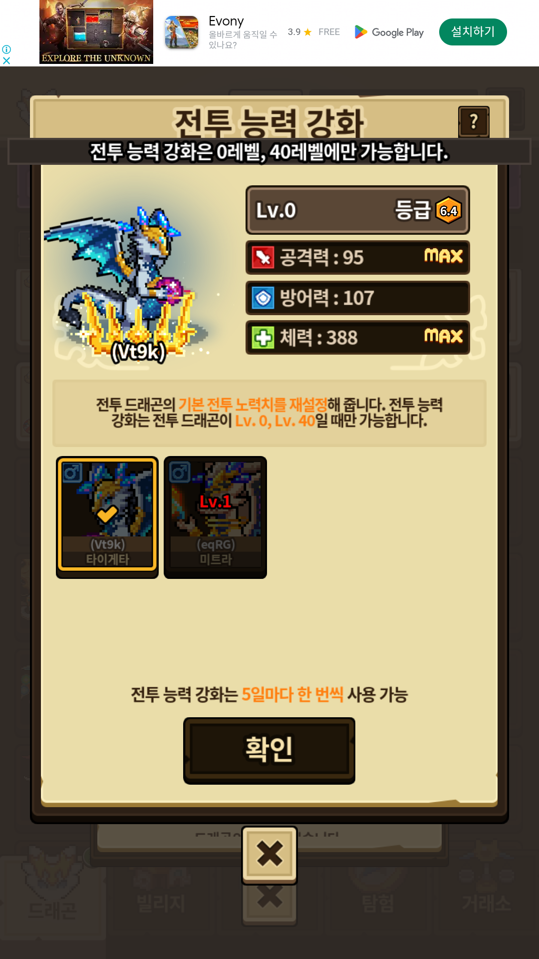 미트라 0렙 7.0(지금 1렙에 트맥 안 떠서 6.3등급 됐습니다..ㅜㅜ), 타이게타 0레벨 7.0 2마리를 보유하게 됐네요.