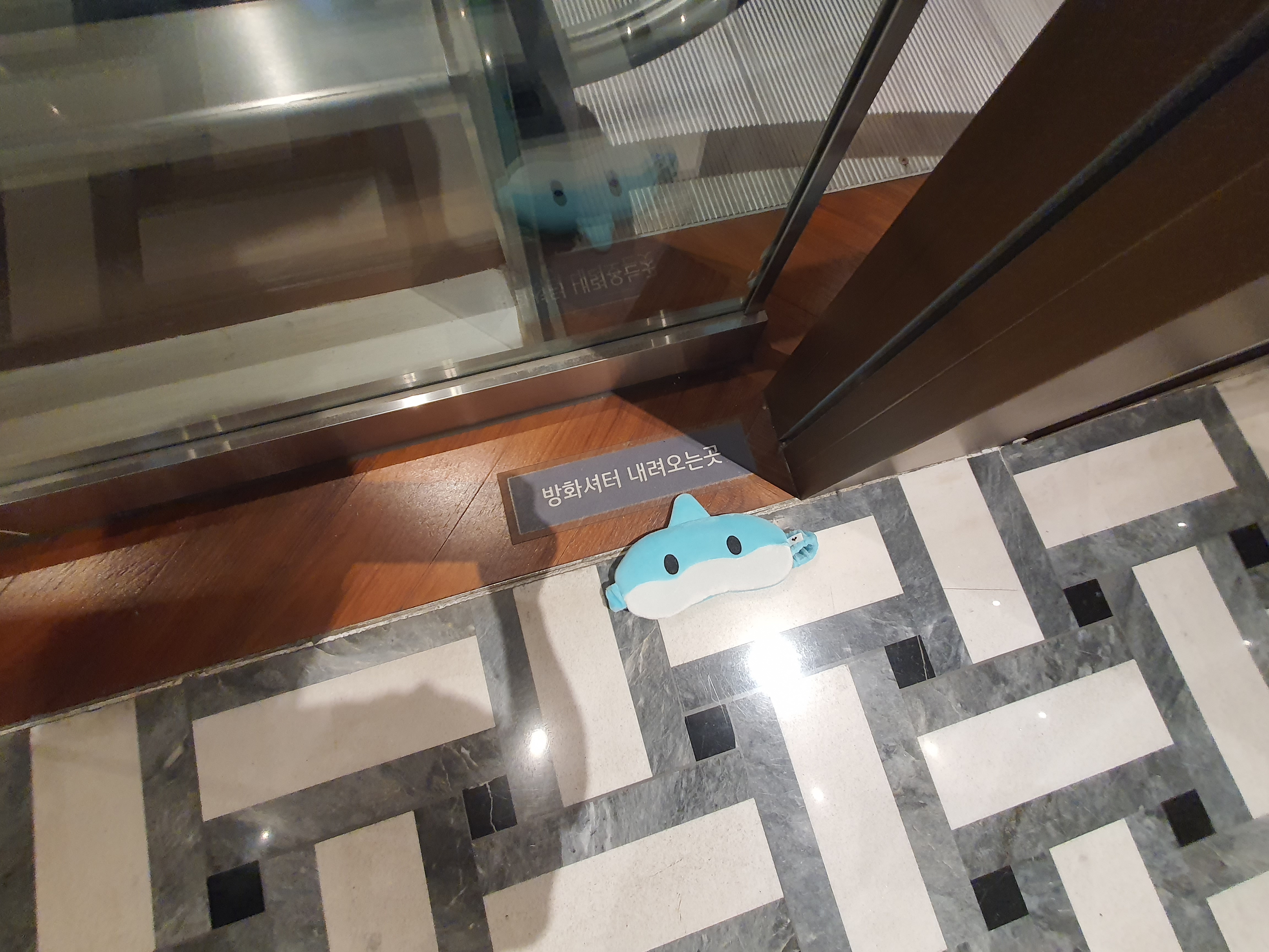 팝업스토어 뒤쪽 내려가는 에스컬레이터 옆에 샤크곤 안대가 떨어져있어요!