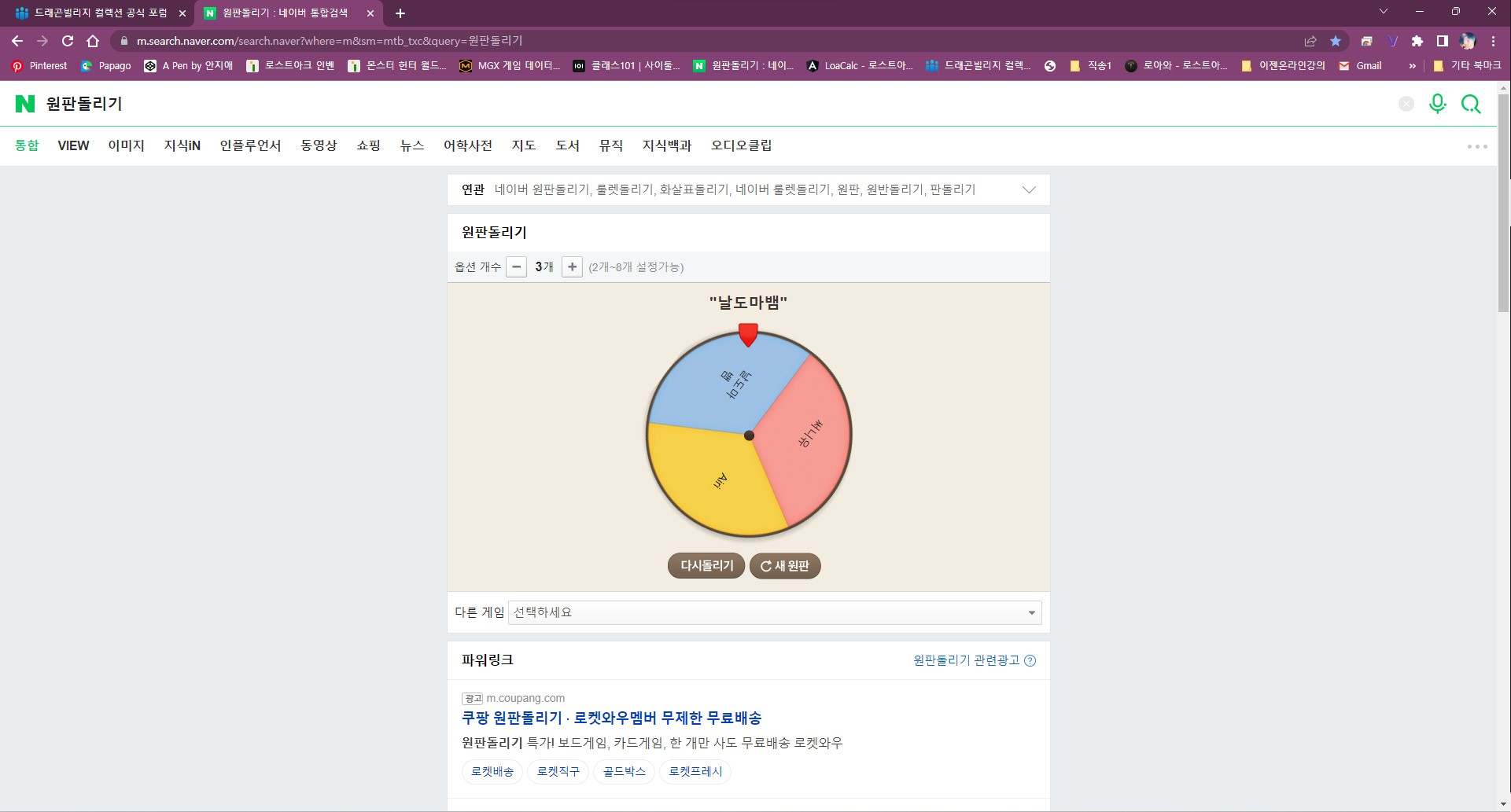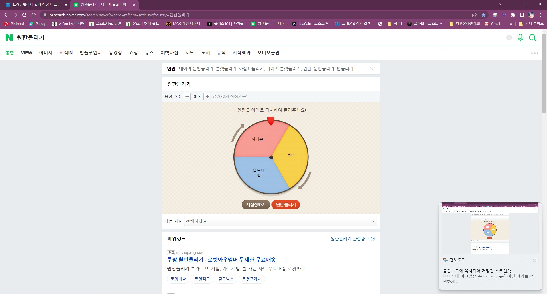 간단하게 원판으로 했습니다 참여자가 적어서 3번 돌렸습니다