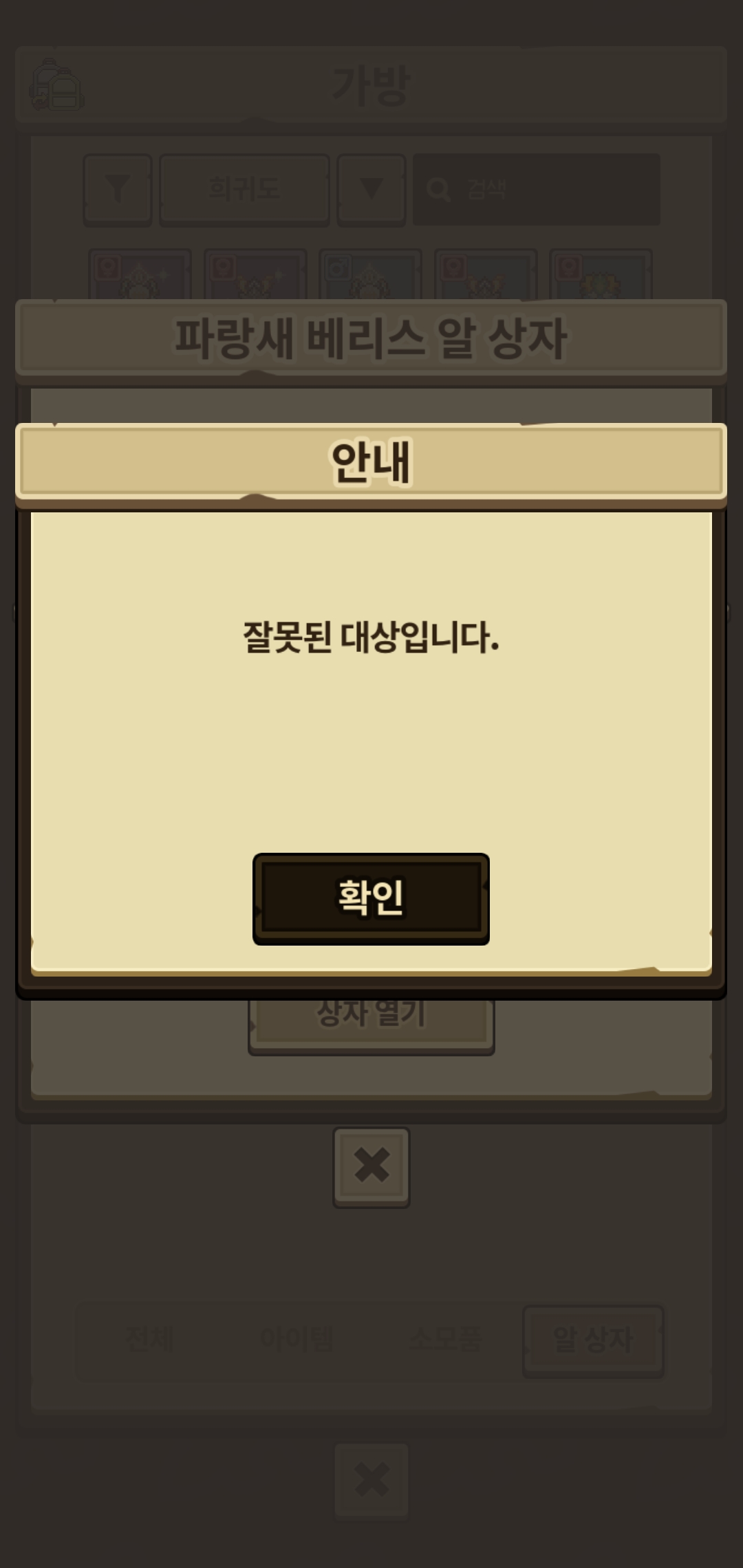 그런데 부화기 이용해서 상자를 까려고 하면 자꾸만 사진 속 문구가 뜨면서 오류가 나버리네요.
