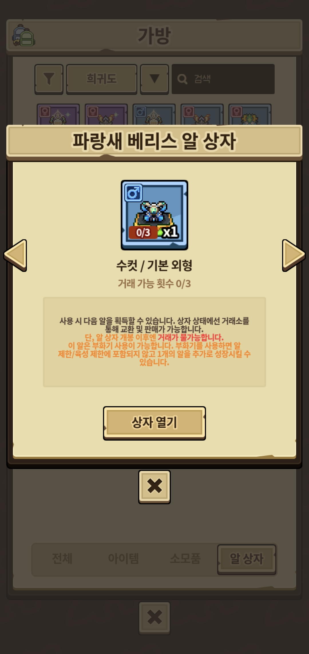부화기 자리가 비어서 아직 코스믹앨범 못 채운 파랑새 베리스를 키우려고 가방을 열었어요.