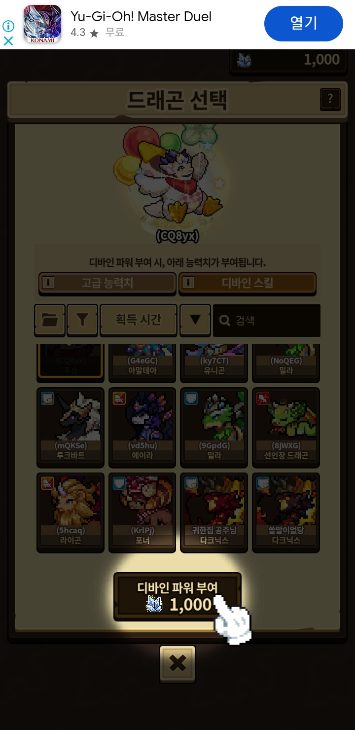 하 다닉 시키려했는데…. 처음 디바인 파워는 가장 최근 성체 고정이네요 아무리 터치해도 안되드라고요 너무하네 진짜!!!!