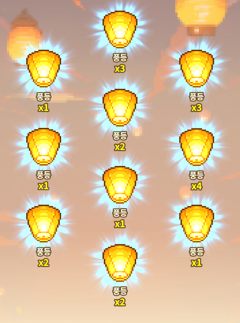 오늘은 5개도 안 나왔네요.. 이벤 대략 7일정도 한 것 같은데 그럼 70번 돌렸는데 2%인 풍등 10개도 안 나왔다는 말이잖아요.. 제가 운이 나쁘다고 할 순 있지만 이벤을 하면서 너무 상처받고 슬프네요