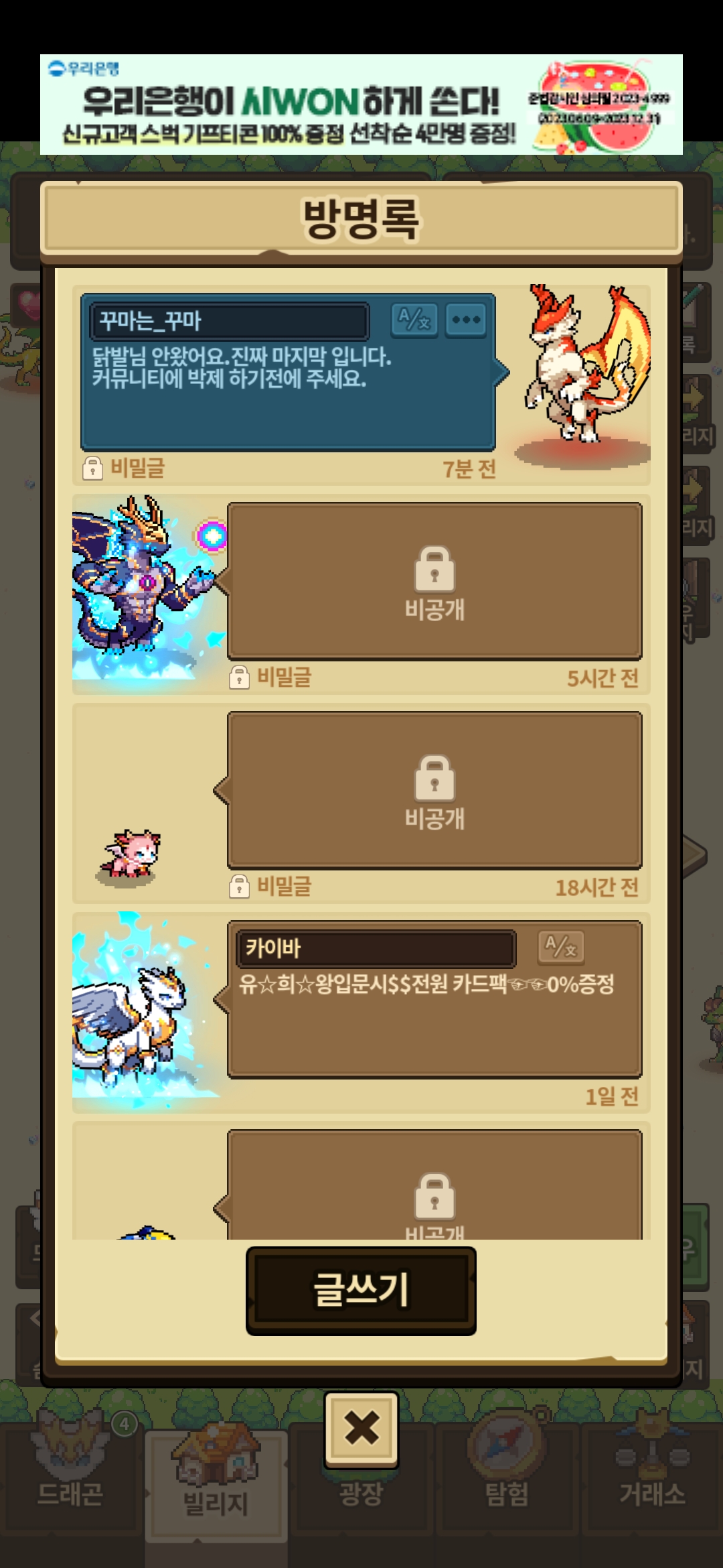 그 분 닉네임과 흑룡이 돌아다니고 있었던 모습과 제가 쓴 방명록 중 남은 비공개 방명록 사진입니다. 전에 그분이 쓴 글을 캡쳐해뒀어야 하는데..