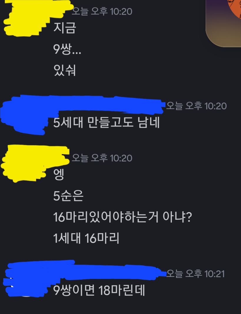 껄껄… 저때 눈치 못챘으면 16쌍 살뻔해서 왜 이리 많냐며 32마리 보고 나중에 눈치채서 오열할뻔했네요 ㅋㅎㅋㅎㅋㄹㅋ