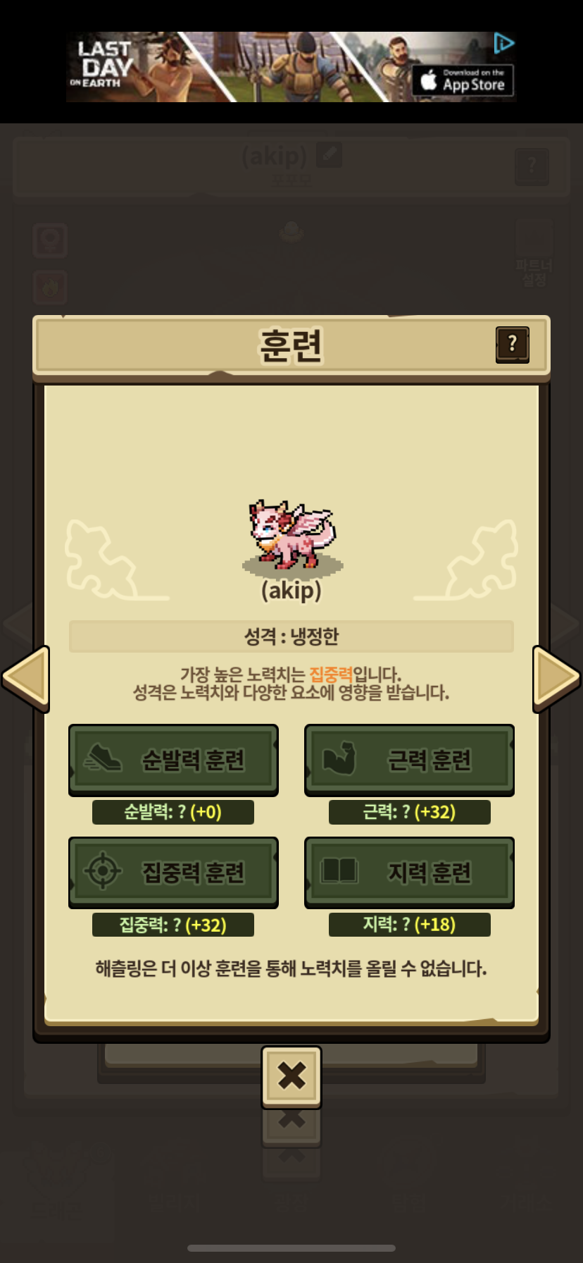 순발력이 20으로 가장높은 능력치여서 다른 것들만 훈련했어요. 꽤 열심히 올린 것 같은데 왜 오만함이 안 뜰까요? 이것도 결국 확률싸움에서 진 거겠죠? ㅠㅠ