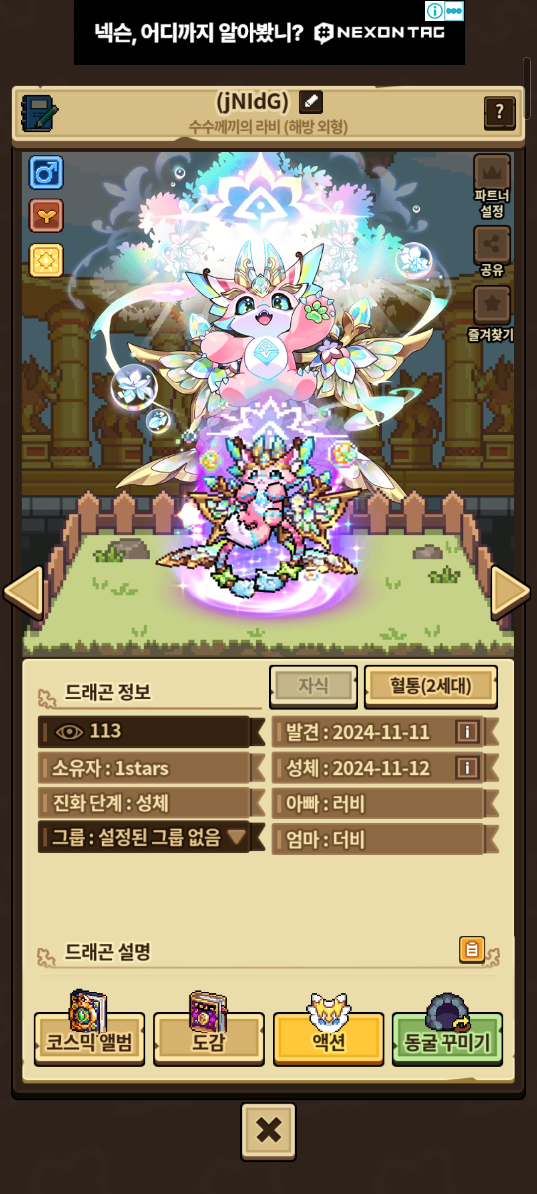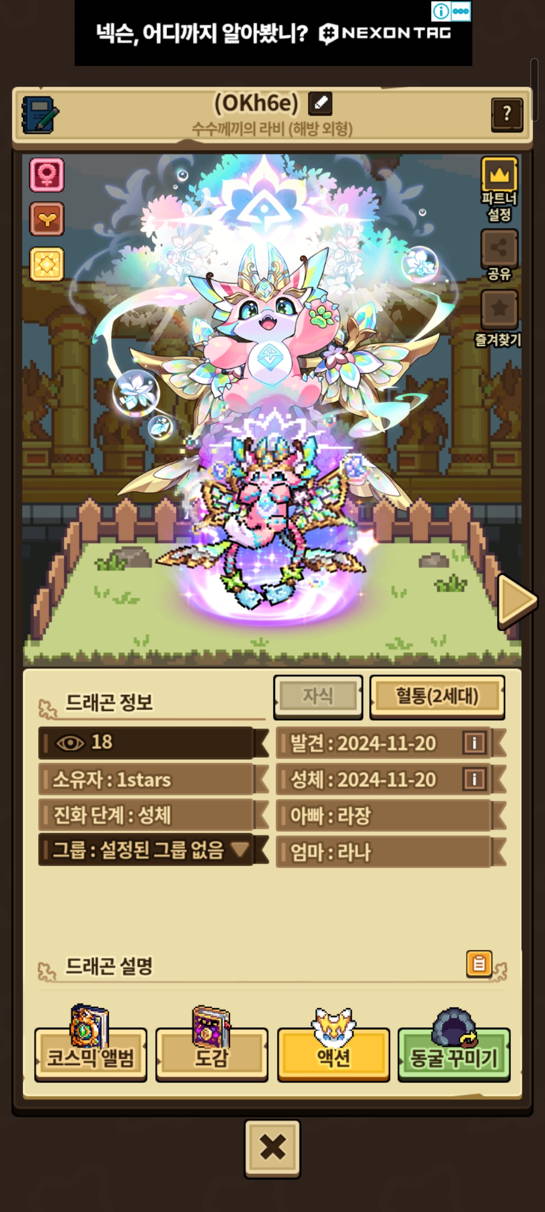 최근에 나눔 열심히 하고 전문 장사꾼 업적도 얻고 노력을 많이 하다가 지금 깨비 장터에서 얻은 드링크로 해방 라비 한 쌍 만드는 데만 2주 넘게 걸린 거 같습니다(더럽게 오래 걸렸어요) 그리고 돌보미 다크 닉스도 그렇고 뭐랄까 어드벤처 드래곤이 또 나온다 하더라고요?(에피트 나온 지 언제라고… 이게 또 나와?) 블라드도 그렇고 돌보미 다크 닉스랑 시그니처 이벤트랑 겹치는 바람에 이 상황을 어떻게 할까 많이 생각 중입니다 해방 라비는 교배를 통해서 해방 외형이 나와도 주변 지인분들게 드린 다음 커뮤에나 거래소에서도 뿌릴 수 있도록 노력할 거고