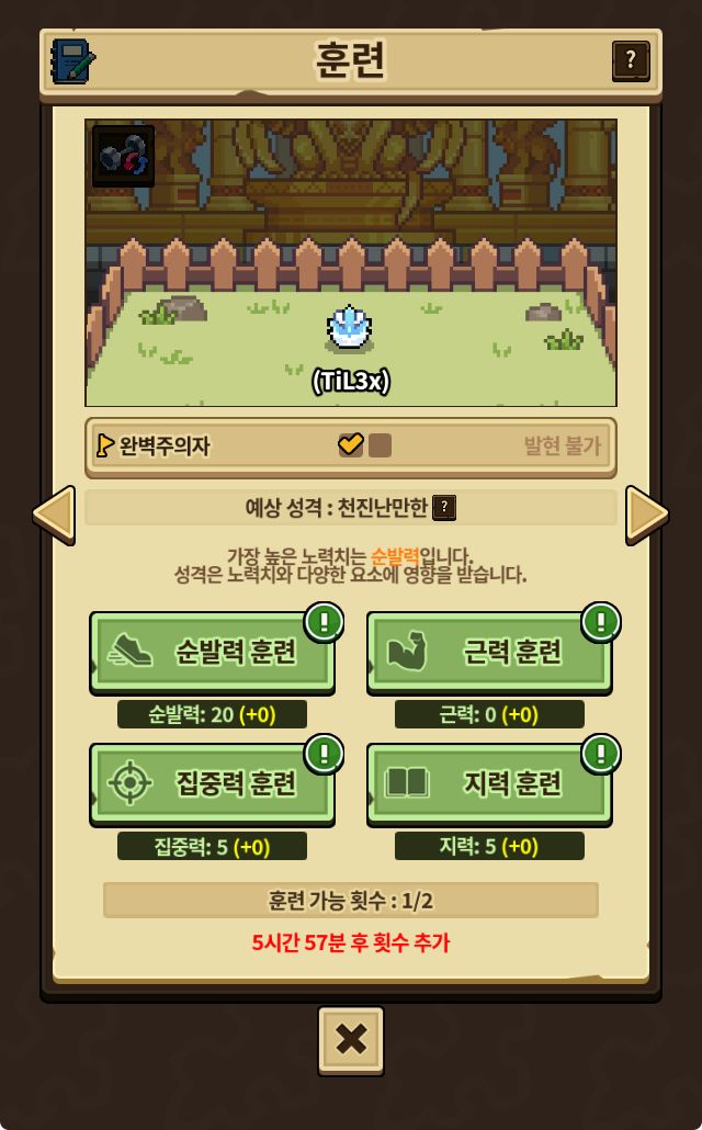지금 사진을 보면 38시간 이내에 발현을 시켜야 하는데,노력치가 20/0/5/5 라서 훈련을 최소 7번 해야 모든 노력치를 20이 넘을수 있으니 훈련 횟수가 최소 7번이나 필요하고,1번은 처음부터 훈련횟수가 있으니 빼면 6번인데 훈련을 한번도 안놓치고 다 챙겨도 훈련은 6시간당 한번 충전되니 36시간. 사실상 훈련 한번이라도 놓치면 아웃이고 성체로 만드는거도 처음부터 돌보기를 한거면 상관 없겠지만 그게 아니면 2시간만에 애정주기가 뜰순 없으니 사실상 드링크를 써야 하는데 너무 빡센거 같아요